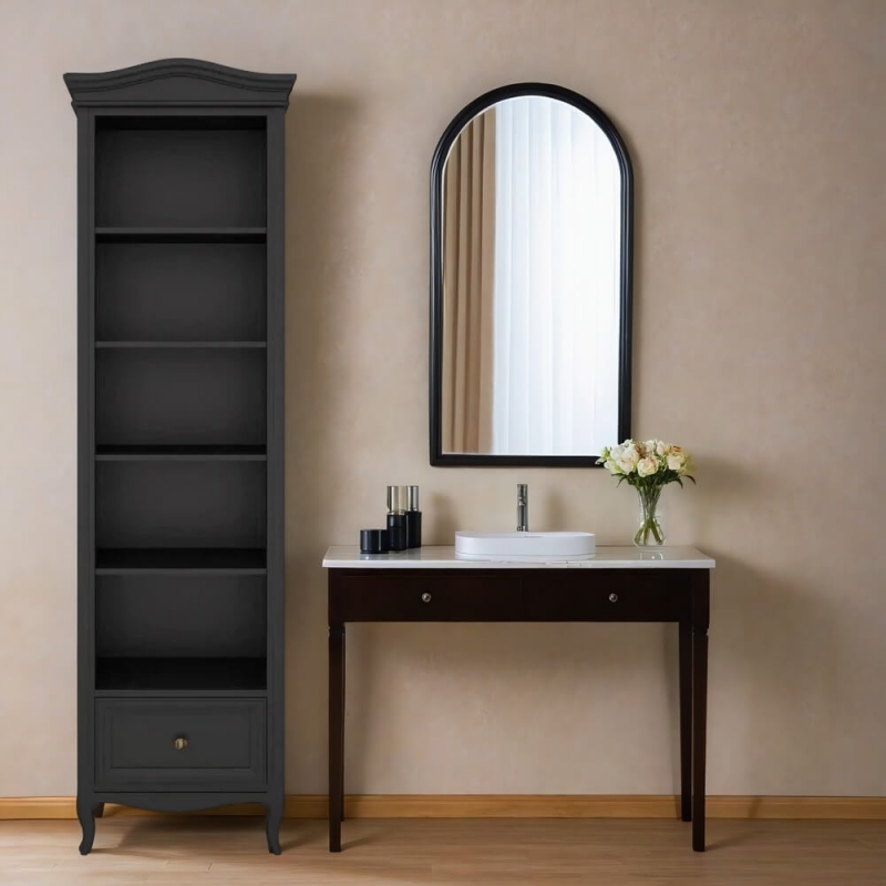 Стеллаж Majessa (Aletan, арт. М605BL) с одним ящиком, в чёрном цвете — элегантное решение для кабинета в неоклассическом стиле. Идеальный вариант для хранения документов. Витрина Алетан Маджесса изготовлен из массива дерева и МДФ с многослойной эмалевой отделкой, гарантирующей долговечность.