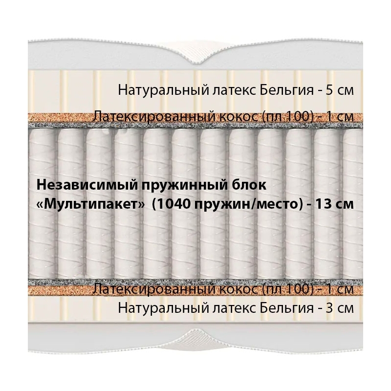 - Пружинный блок независимых пружин в чехлах из долговечного файбертекса Multipocket 1000 (1040 пружин на спальное место) — высота 13 см. Блок Мультипакет обладает идеальным балансом между хорошей поддержкой и комфортной мягкостью;