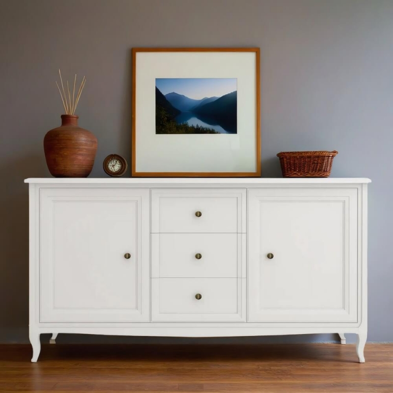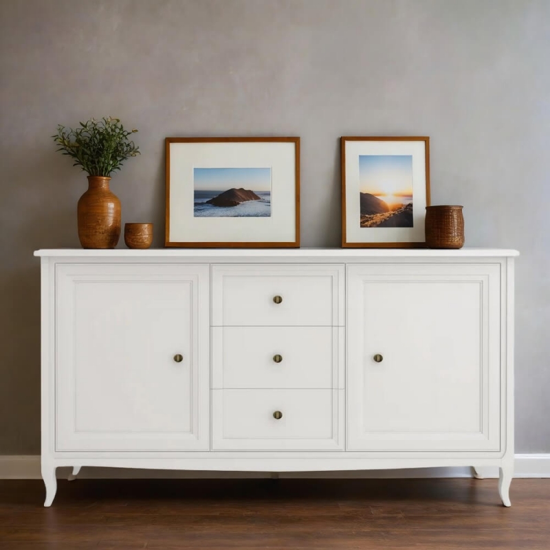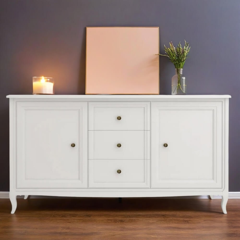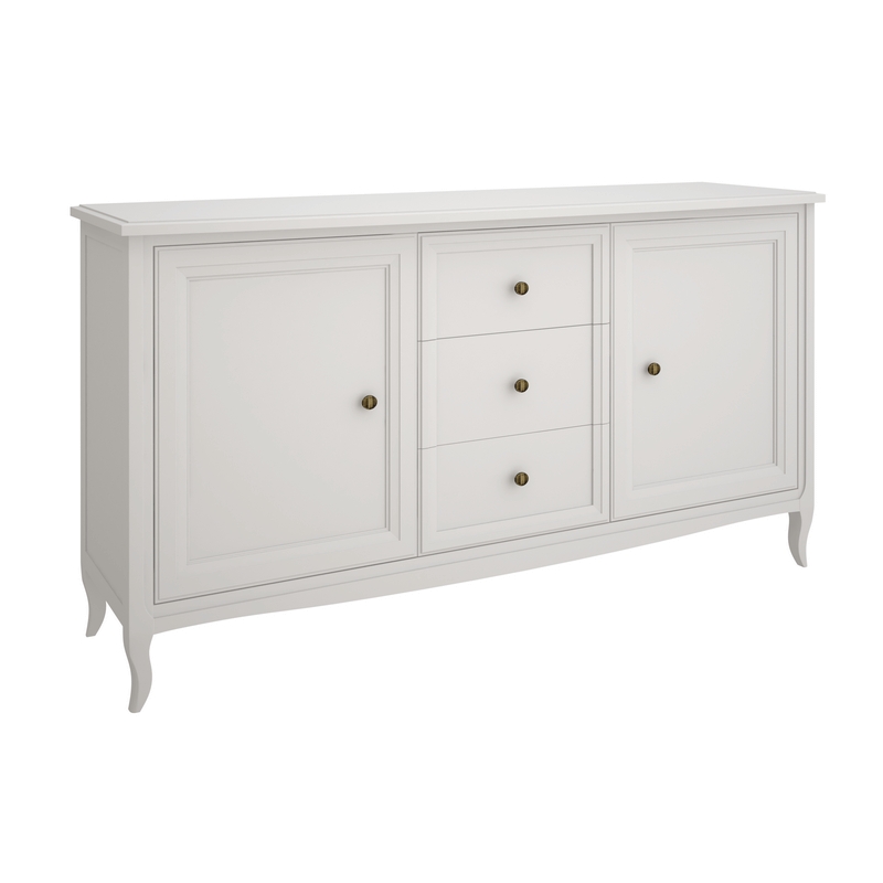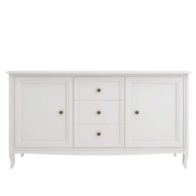 Прилавок Majessa (Aletan, арт. М403W) с тремя ящиками и двумя дверцами, в белом цвете — элегантное решение для гостиной в неоклассическом стиле. Комод Алетан Маджесса изготовлен из массива дерева и МДФ с многослойной эмалевой отделкой, гарантирующей долговечность.