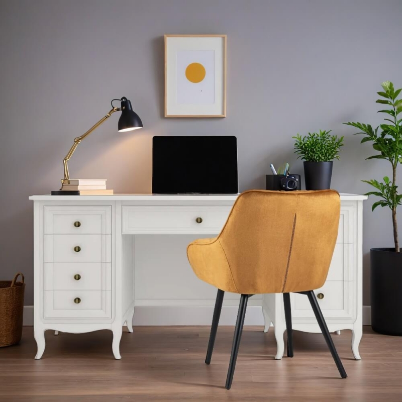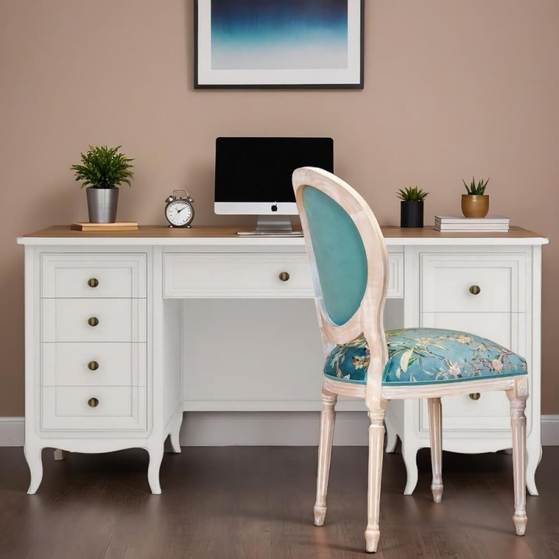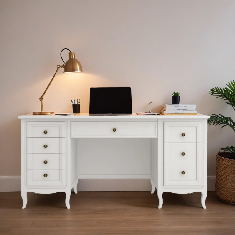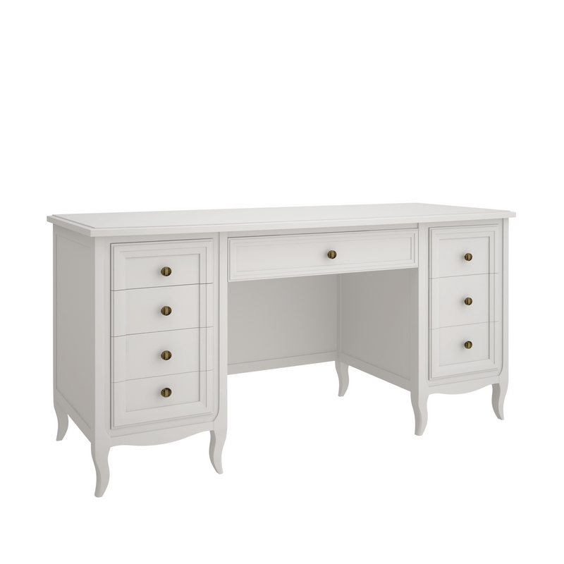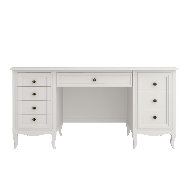 Письменный стол Majessa (Aletan, арт. М709W) с восьмью ящиками, в белом цвете — элегантное решение для кабинета в неоклассическом стиле. Стол Алетан Маджесса изготовлен из массива дерева и МДФ с многослойной эмалевой отделкой, гарантирующей долговечность.