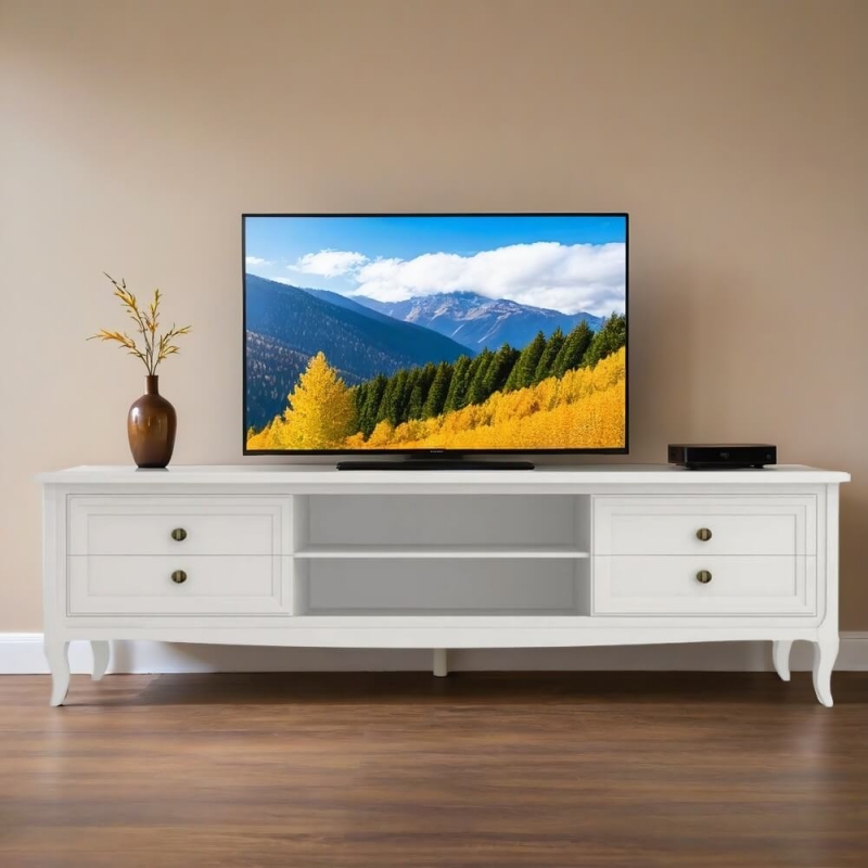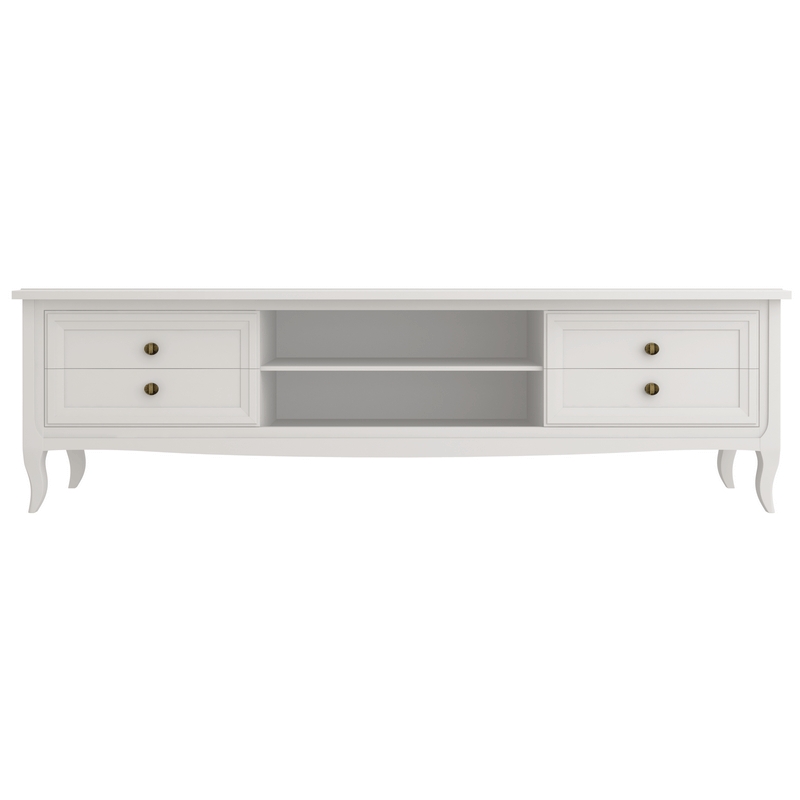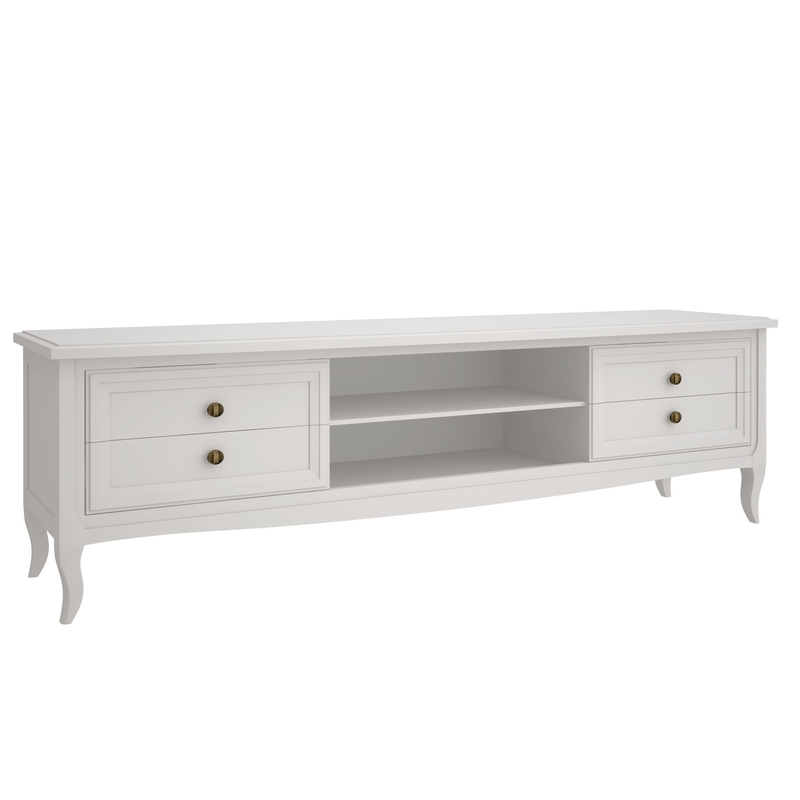 ТВ тумба Majessa (Aletan, арт. М305W) с четырьмя ящиками и двумя нишами под тв приставку, в белом цвете — элегантное решение для гостиной в неоклассическом стиле. Комод Алетан Маджесса изготовлен из массива дерева и МДФ с многослойной эмалевой отделкой, гарантирующей долговечность.