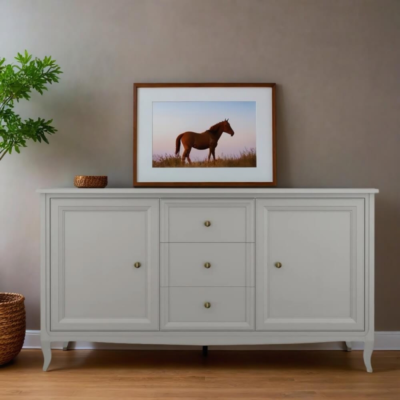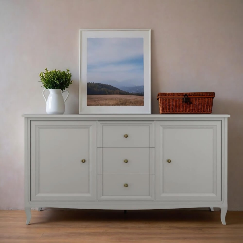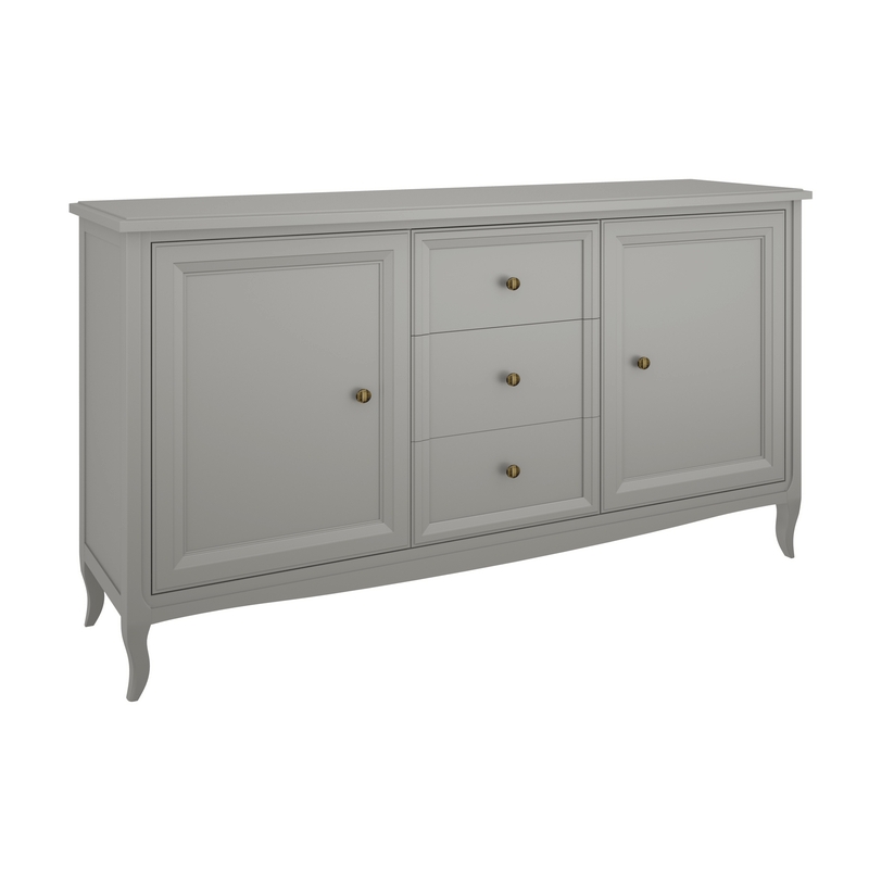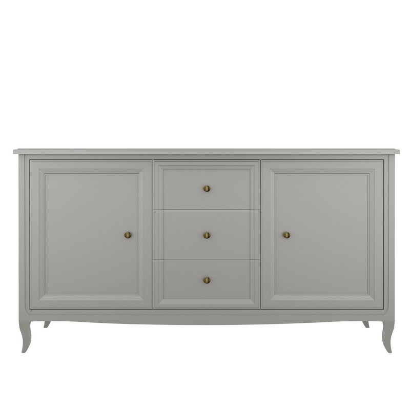 Прилавок Majessa (Aletan, арт. М403G) с тремя ящиками и двумя дверцами, в сером цвете — элегантное решение для гостиной в неоклассическом стиле. Комод Алетан Маджесса изготовлен из массива дерева и МДФ с многослойной эмалевой отделкой, гарантирующей долговечность.