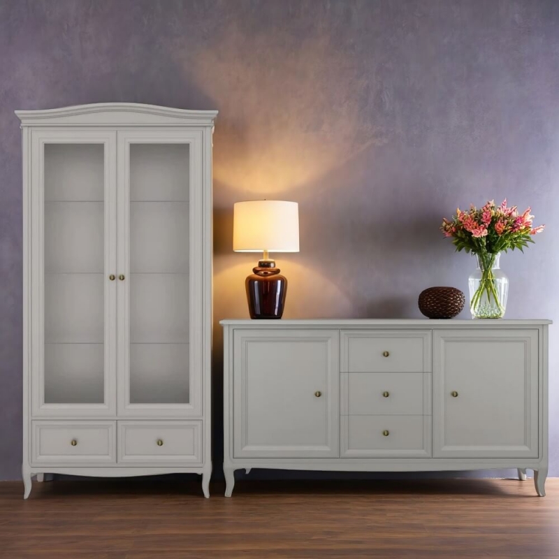 Гостиная Aletan Majessa — это сочетание классической симметрии и продуманной функциональности. Изящные ручки и сбалансированные формы подчёркивают неоклассический характер коллекции, делая её уместной как в традиционных, так и в современных интерьерах. Использование фурнитуры с доводчиками и плавным закрыванием повышает уровень комфорта в ежедневной эксплуатации.