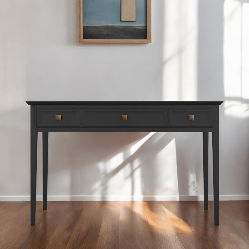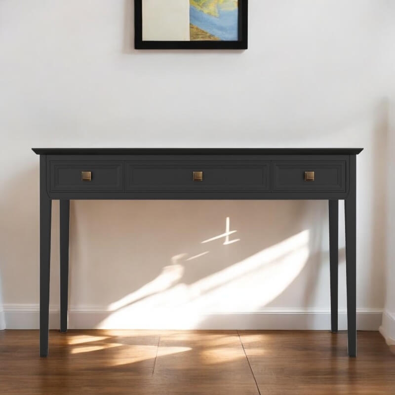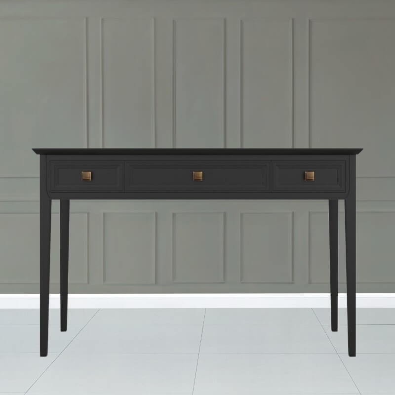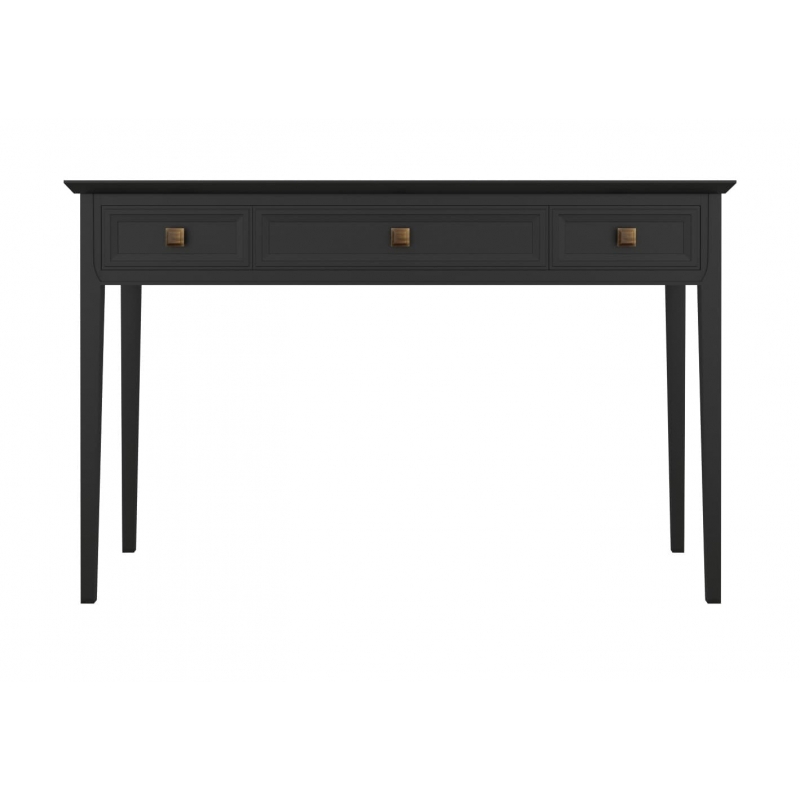 Консоль Tesoro (Aletan, арт. T903BL) с тремя ящиками, в чёрном цвете — элегантное решение для кабинета в неоклассическом стиле. Консоль Алетан Тесоро изготовлена из массива дерева (бук), МДФ и фанеры (берёза) с многослойной эмалевой отделкой, обеспечивающей долговечность и сохранение привлекательного внешнего вида на долгие годы.