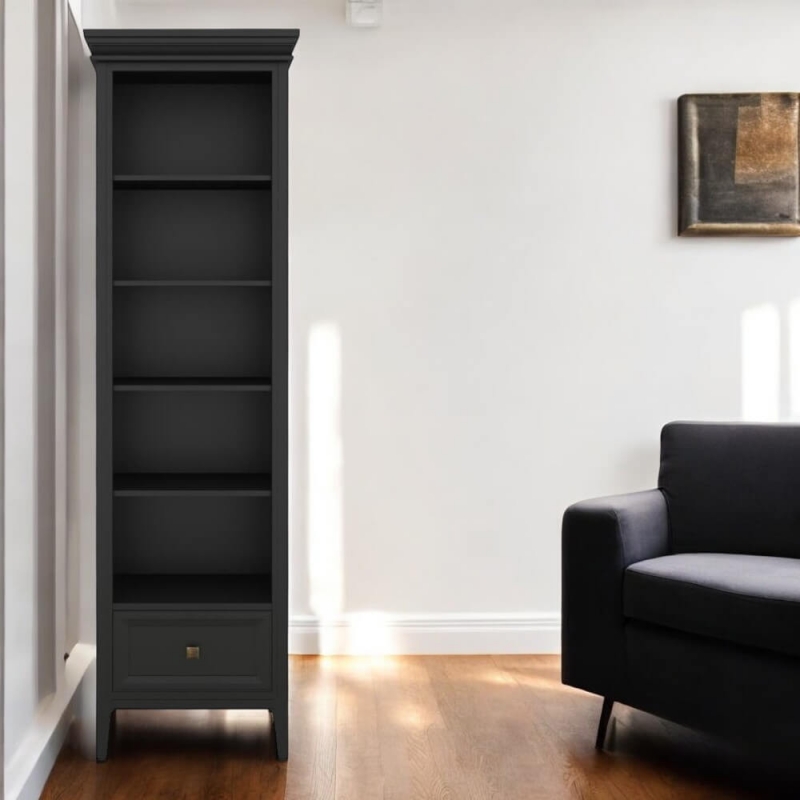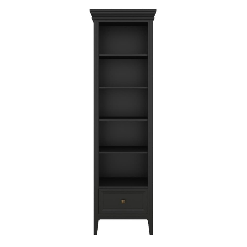 Стеллаж Tesoro (Aletan, арт. T605BL) с одним ящиком, в чёрном цвете — элегантное решение для кабинета в неоклассическом стиле. Идеальный вариант для хранения документов. Стеллаж Алетан Тесоро изготовлен из массива дерева (бук), МДФ и фанеры (берёза) с многослойной эмалевой отделкой, обеспечивающей долговечность и сохранение привлекательного внешнего вида на долгие годы.