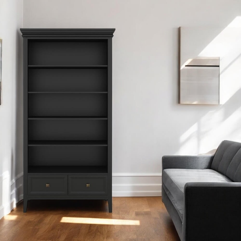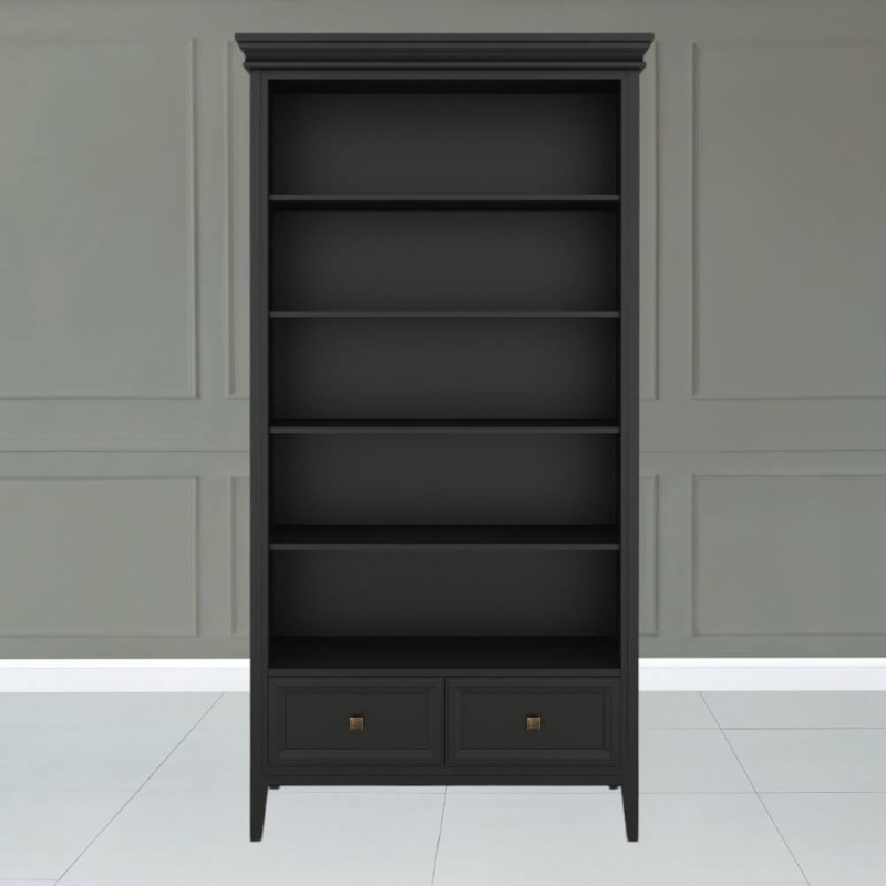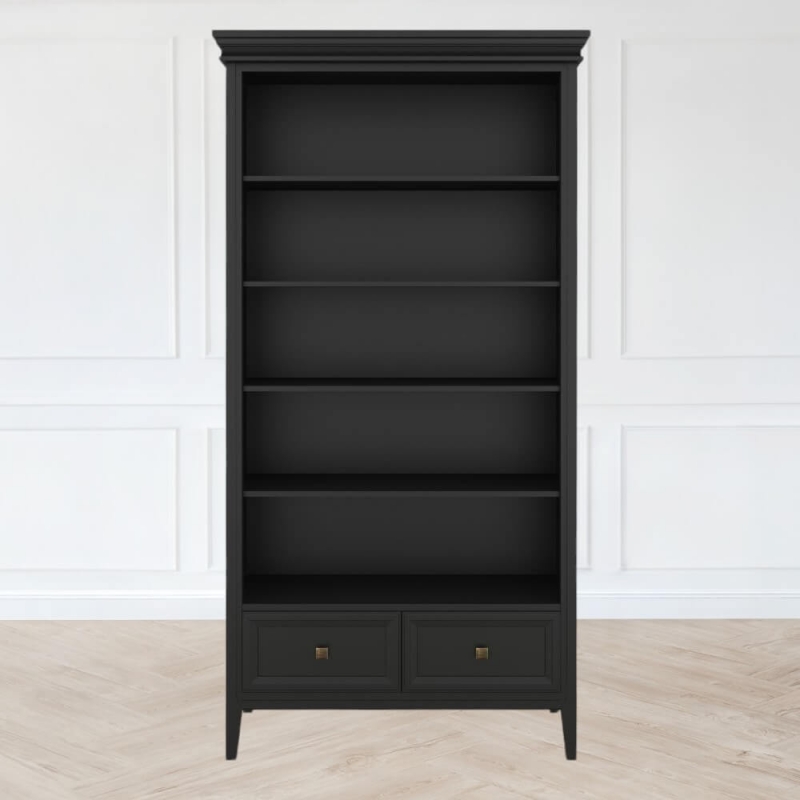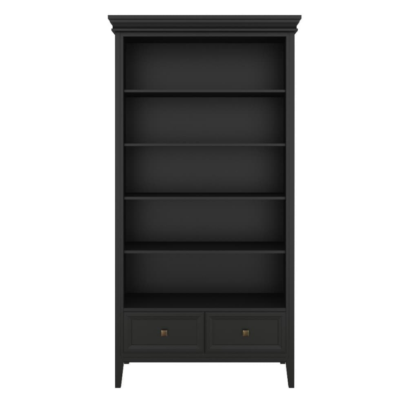 Стеллаж Tesoro (Aletan, арт. T606BL) с двумя ящиками, в чёрном цвете — элегантное решение для кабинета в неоклассическом стиле. Идеальный вариант для хранения документов. Стеллаж Алетан Маджесса изготовлен из массива дерева (бук), МДФ и фанеры (берёза) с многослойной эмалевой отделкой, обеспечивающей долговечность и сохранение привлекательного внешнего вида на долгие годы.
