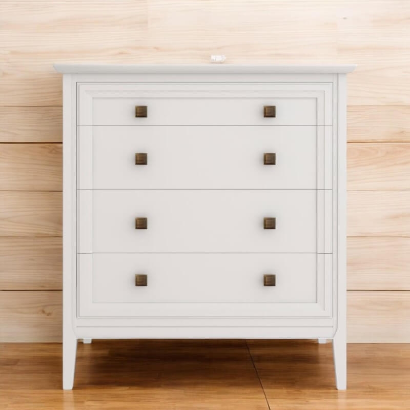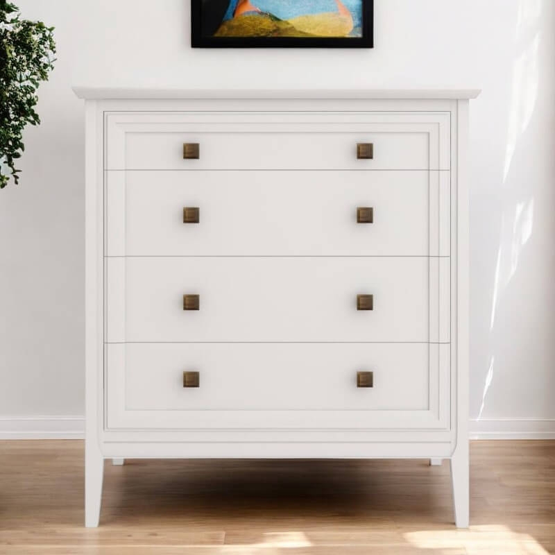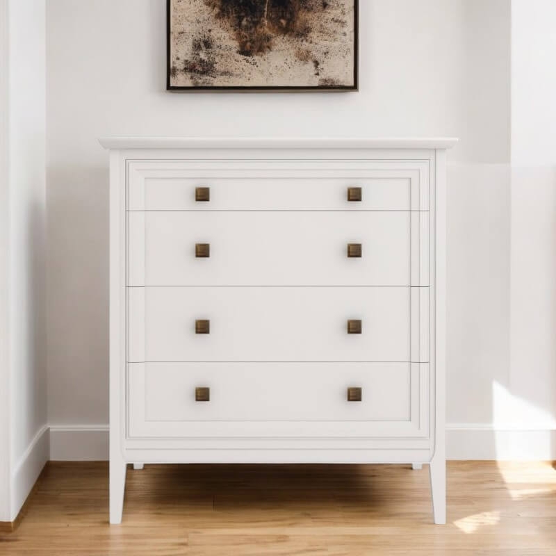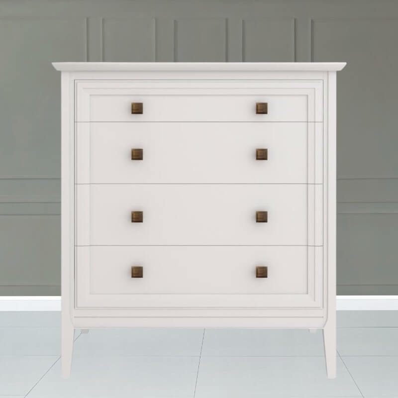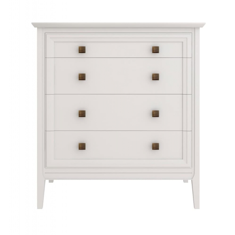 Комод Tesoro (Aletan, арт. T404W) с четырьмя ящиками, в белом цвете — элегантное решение для спальни в неоклассическом стиле. Комод Алетан Тесоро изготовлен из массива дерева (бук), МДФ и фанеры (берёза) с многослойной эмалевой отделкой, обеспечивающей долговечность и сохранение привлекательного внешнего вида на долгие годы.