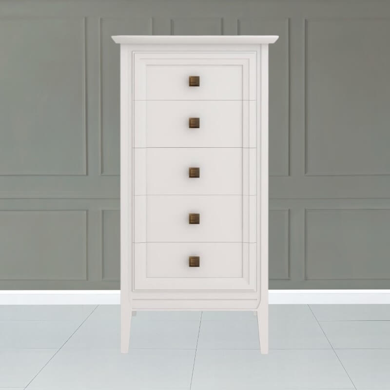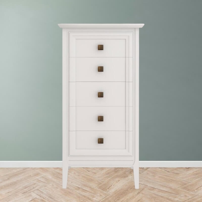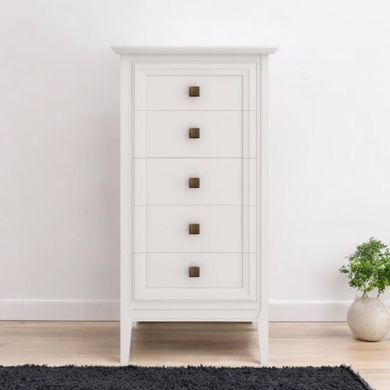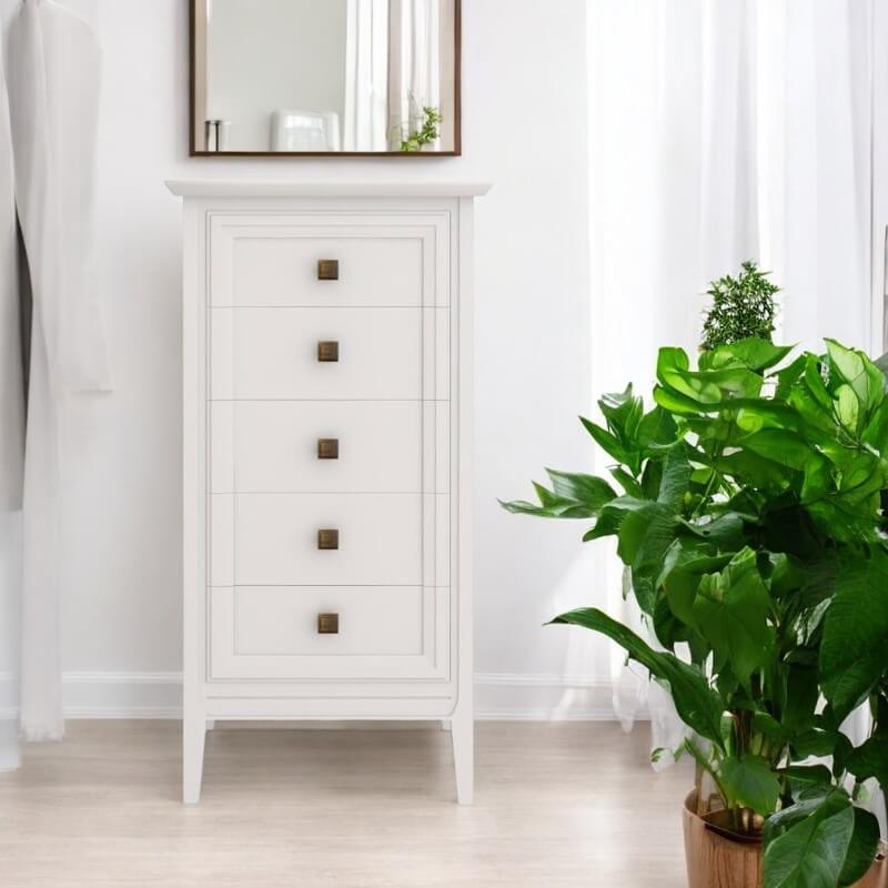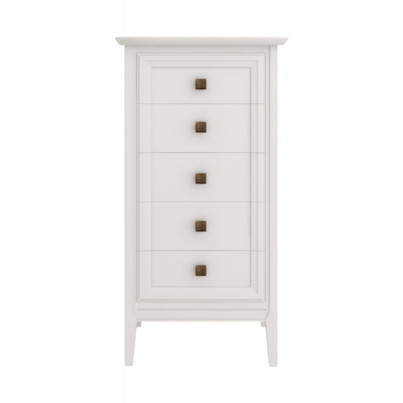 Высокий комод Tesoro (Aletan, арт. T315W) с пятью ящиками, в белом цвете — элегантное решение для спальни в неоклассическом стиле. Комод Алетан Тесоро изготовлен из массива дерева и МДФ с многослойной эмалевой отделкой, гарантирующей долговечность.