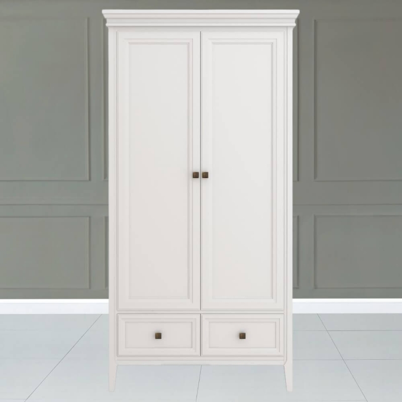 Стильный небольшой двухдверный шкаф Tesoro (Aletan, арт. T802W) с двумя ящиками, в белом цвете — элегантное решение для спальни в неоклассическом стиле. Шкаф Алетан Тесоро изготовлен из массива дерева (бук), МДФ и фанеры (берёза) с многослойной эмалевой отделкой, обеспечивающей долговечность и сохранение привлекательного внешнего вида на долгие годы.