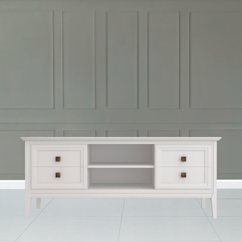 ТВ тумба Tesoro (Aletan, арт. T304W) с четырьмя ящиками и двумя нишами под тв приставку, в белом цвете — элегантное решение для гостиной в неоклассическом стиле. Тумба ТВ Алетан Тесоро изготовлена из массива дерева (бук), МДФ и фанеры (берёза) с многослойной эмалевой отделкой, обеспечивающей долговечность и сохранение привлекательного внешнего вида на долгие годы.