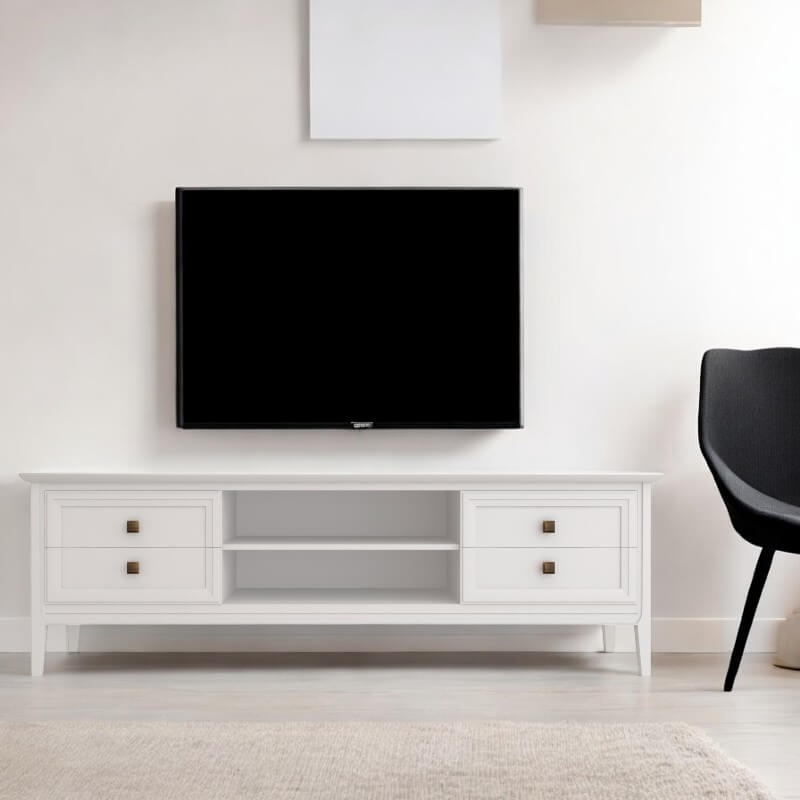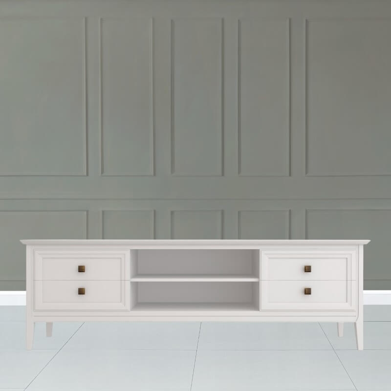 ТВ тумба Tesoro (Aletan, арт. T305W) с четырьмя ящиками и двумя нишами под тв приставку, в белом цвете — элегантное решение для гостиной в неоклассическом стиле. Телевизионная тумба Алетан Тесоро изготовлена из массива дерева (бук), МДФ и фанеры (берёза) с многослойной эмалевой отделкой, обеспечивающей долговечность и сохранение привлекательного внешнего вида на долгие годы.