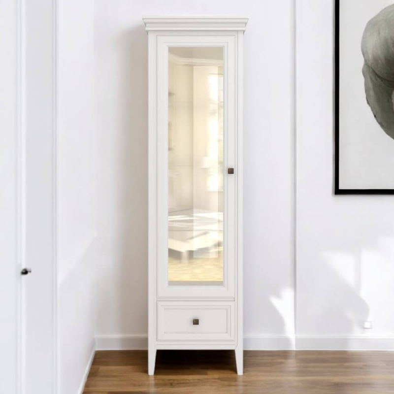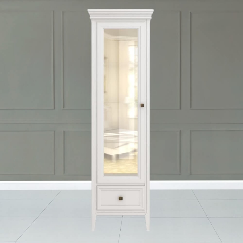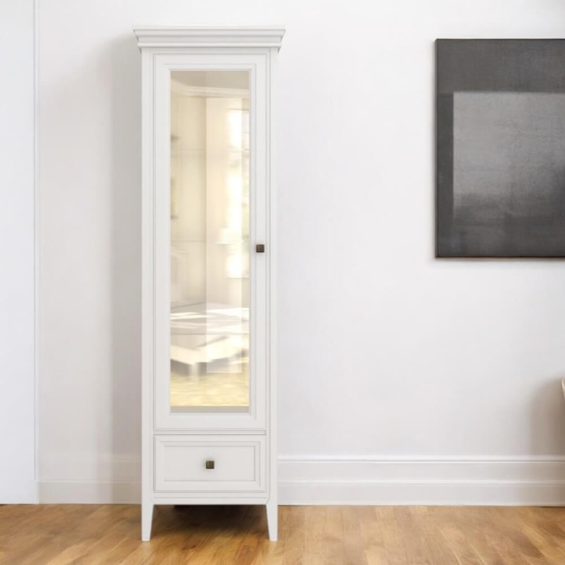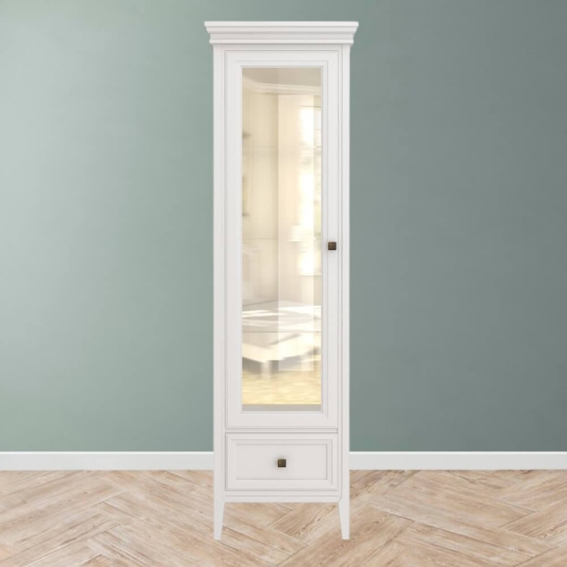 Однодверная витрина в правом исполнении Tesoro (Aletan, арт. T601R/W) с одним ящиком, в белом цвете — элегантное решение для гостиной в неоклассическом стиле. Идеальный вариант для хранения посуды или сувениров. Витрина Алетан Тесоро изготовлена из массива дерева (бук), МДФ и фанеры (берёза) с многослойной эмалевой отделкой, обеспечивающей долговечность и сохранение привлекательного внешнего вида на долгие годы.