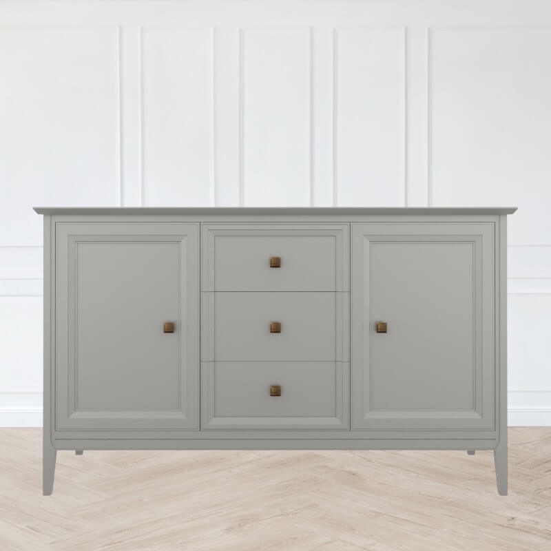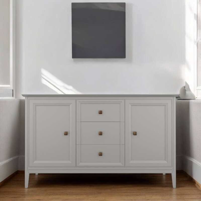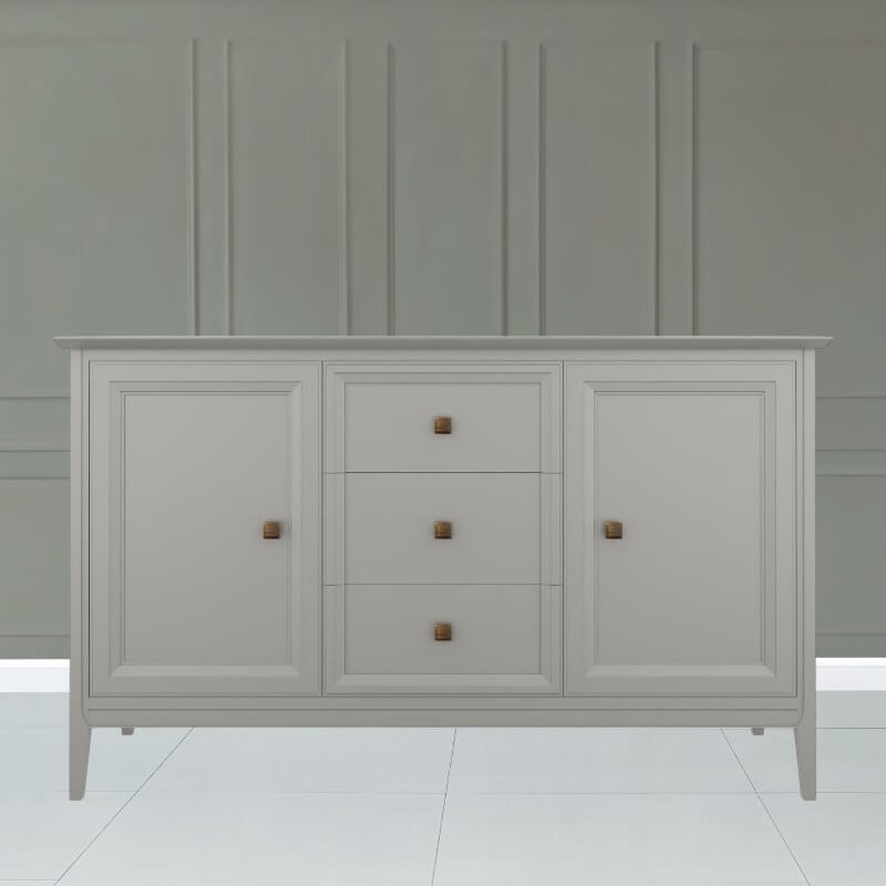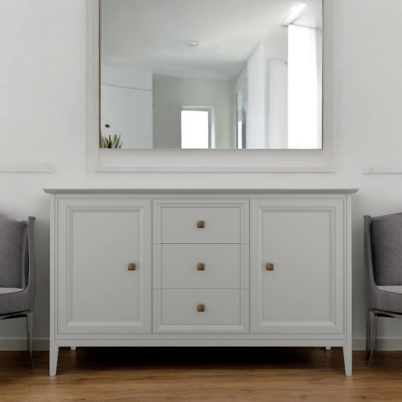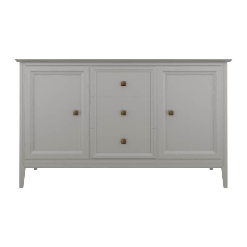 Прилавок Tesoro (Aletan, арт. T403G) с тремя ящиками и двумя дверцами, в сером цвете — элегантное решение для гостиной в неоклассическом стиле. Комод Алетан Тесоро изготовлен из массива дерева и МДФ с многослойной эмалевой отделкой, гарантирующей долговечность.