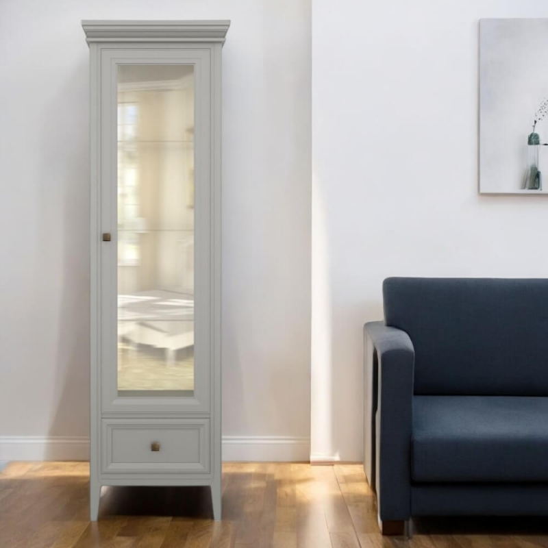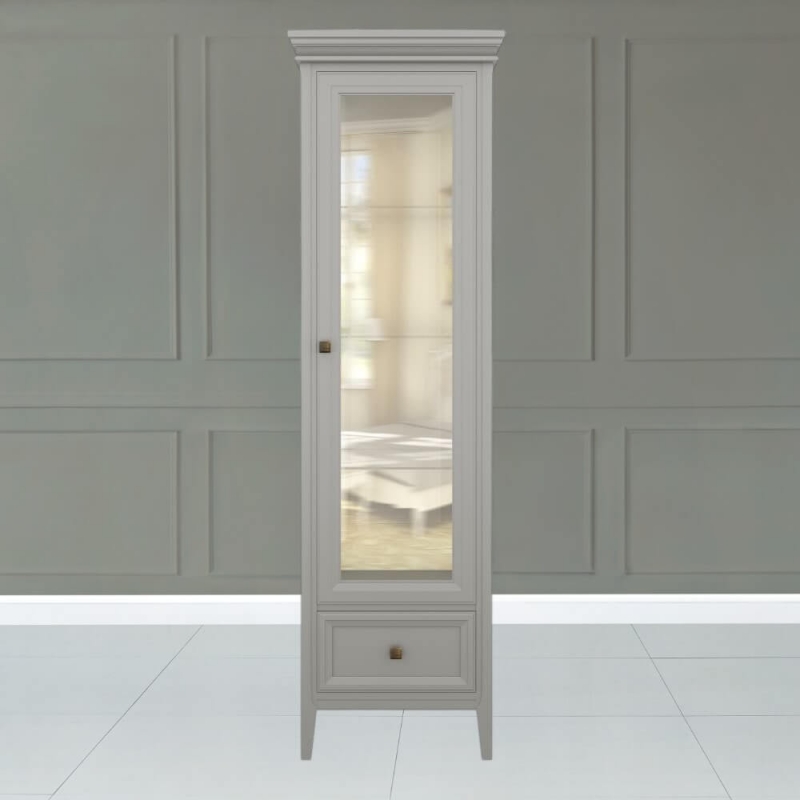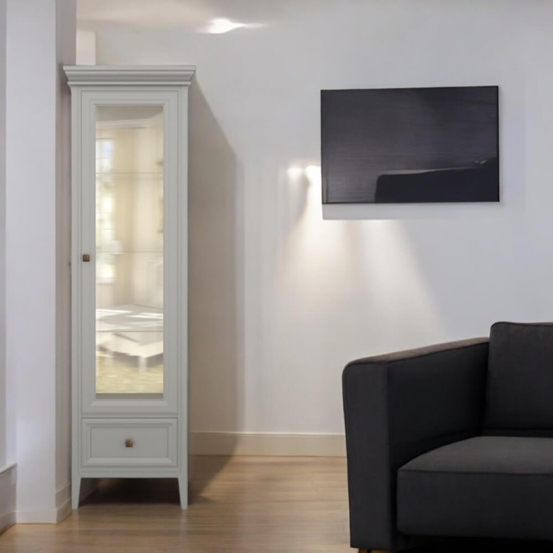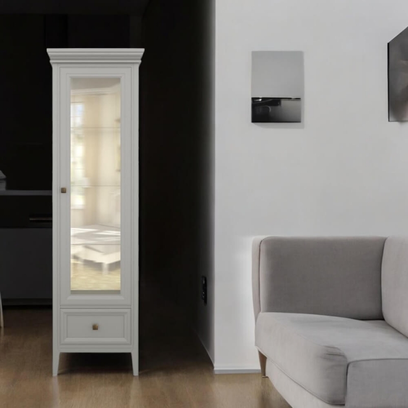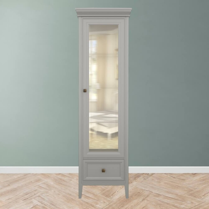 Однодверная витрина в левом исполнении Tesoro (Aletan, арт. T601L/G) с одним ящиком, в сером цвете — элегантное решение для гостиной в неоклассическом стиле. Идеальный вариант для хранения посуды или сувениров. Витрина Алетан Тесоро изготовлена из массива дерева (бук), МДФ и фанеры (берёза) с многослойной эмалевой отделкой, обеспечивающей долговечность и сохранение привлекательного внешнего вида на долгие годы.