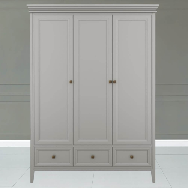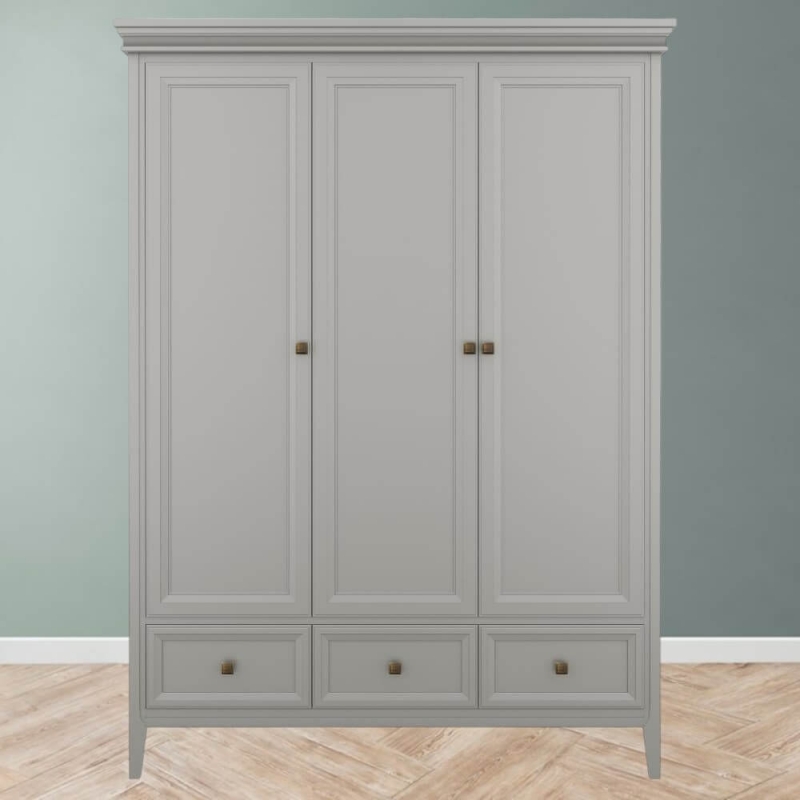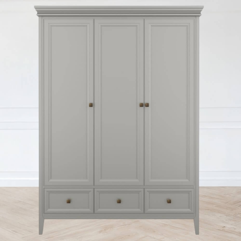 Стильный трехдверный шкаф Tesoro (Aletan, арт. T803G) с тремя ящиками, в сером цвете — элегантное решение для спальни в неоклассическом стиле. Шкаф Алетан Тесоро изготовлена из массива дерева (бук), МДФ и фанеры (берёза) с многослойной эмалевой отделкой, обеспечивающей долговечность и сохранение привлекательного внешнего вида на долгие годы.