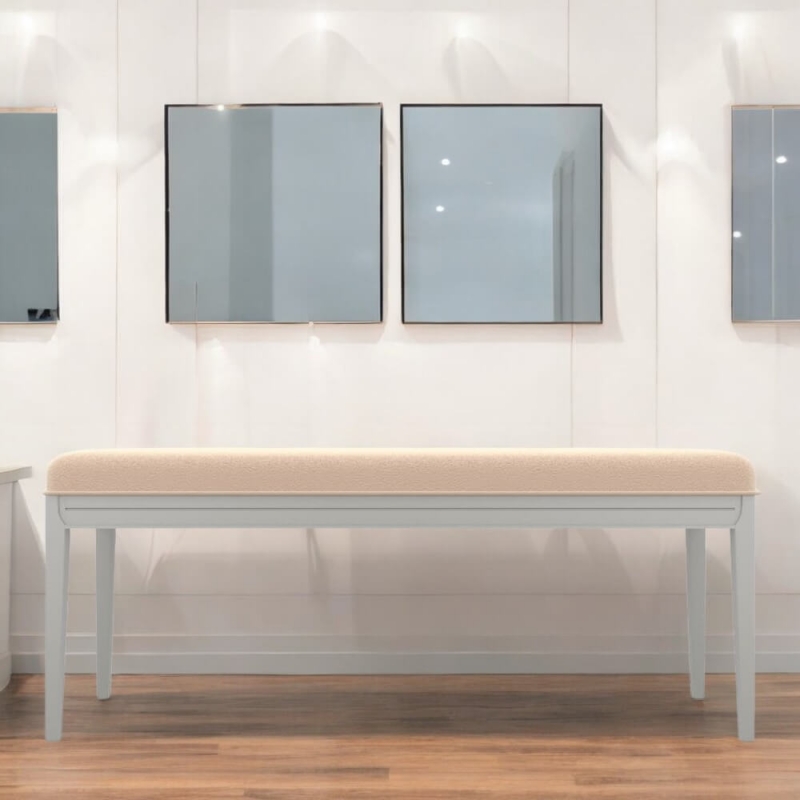Коллекция изготавливается из массива бука, МДФ высокого качества и берёзовой фанеры, что обеспечивает прочность конструкции и долговечность в эксплуатации. Многослойное эмалевое покрытие формирует устойчивую к износу поверхность с ровным, насыщенным серым оттенком.