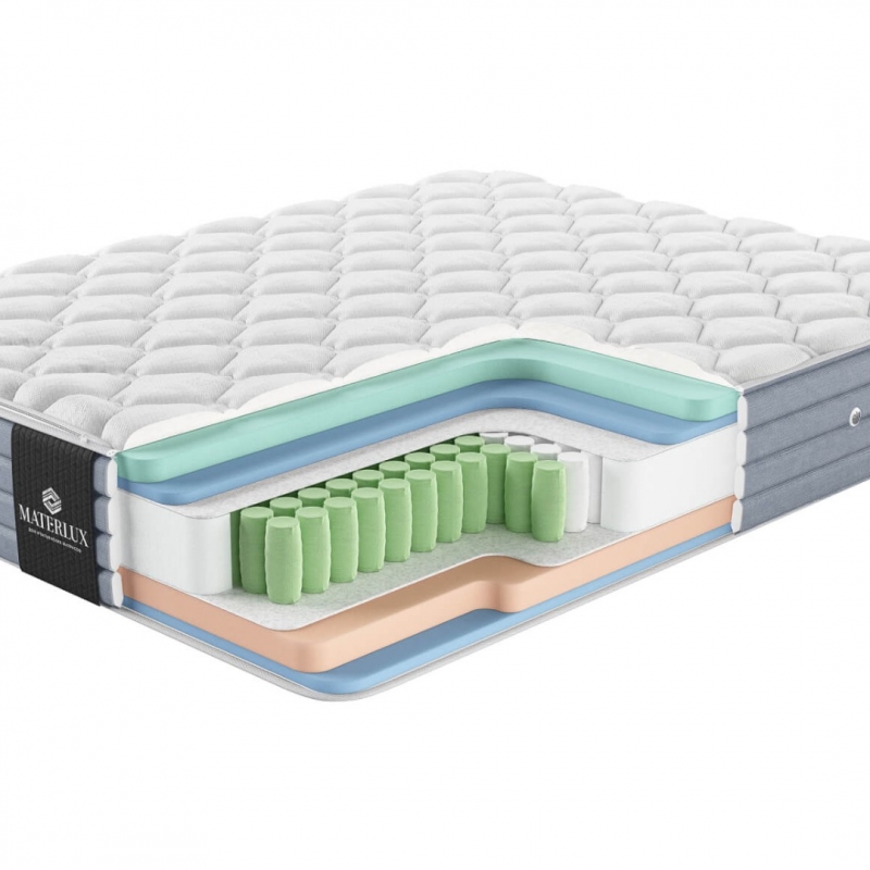 Двухсторонний матрас фабрики MaterLux, модель Gabbro серии Elite, с слоем пены Natural Foam, двумя слоями Memory Foam и слоем Memory Гель, все это собрано на блоке независимых пружин Дуэт (520 пружин на место).
