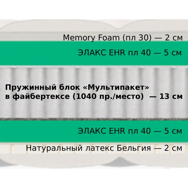 Двухсторонний матрас фабрики MaterLux, модель Babila серии Elite, с двумя слоями ЭЛАКС EHR, слоем пены Memory Foam и натурального латекса, все это собрано на блоке независимых пружин Мультипакет (1040 пружин на место).
