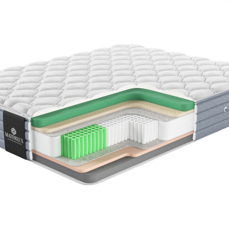 Двухсторонний матрас фабрики MaterLux, модель Antico серии Elite, с слоем ЭЛАКС EHR, слоем пены Natural Foam, натурального латекса, а также слоем эрголатекса Carbone, все это собрано на блоке независимых пружин Мультипакет (1040 пружин на место).