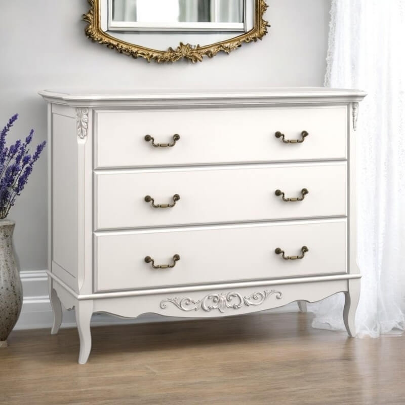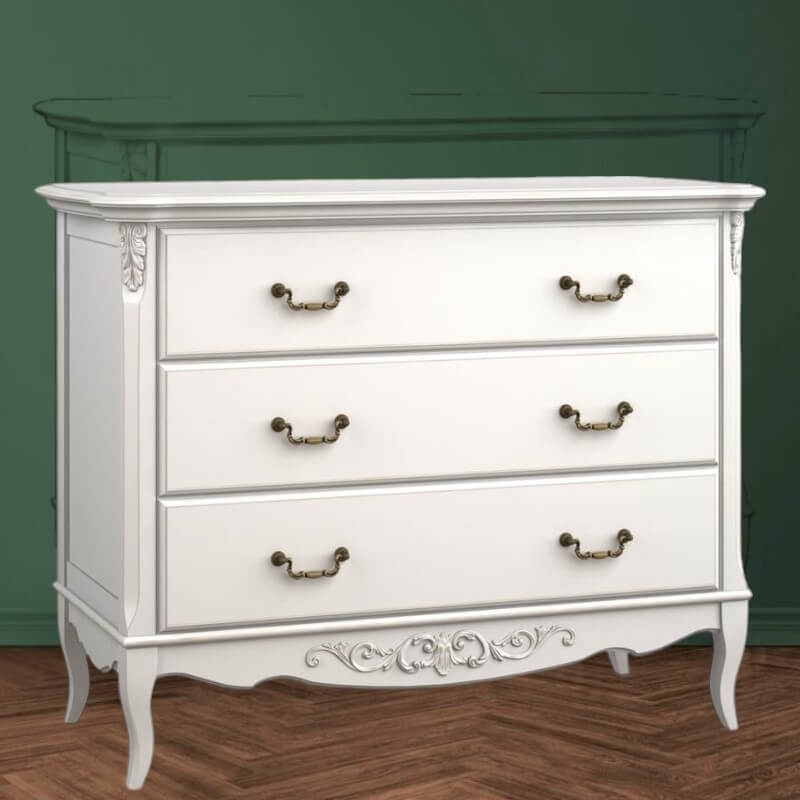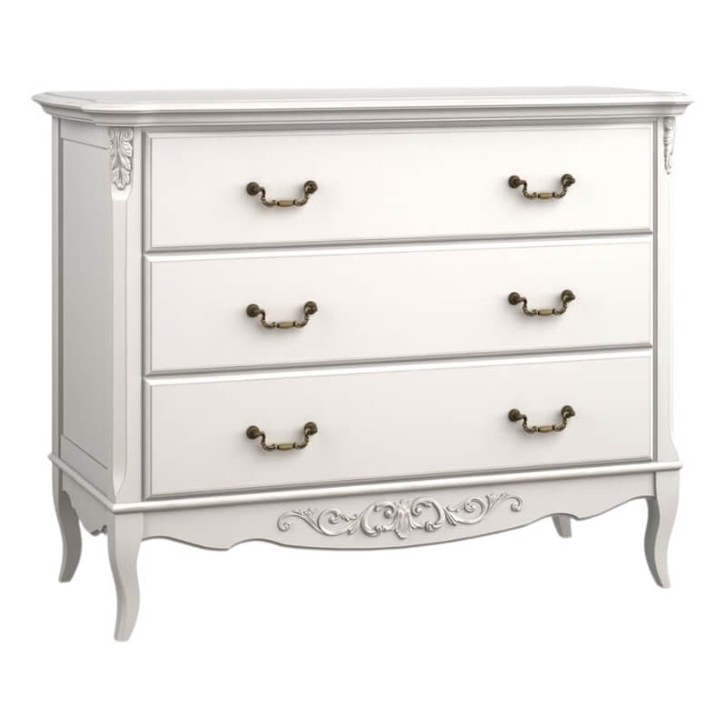 Комод Marlette (Aletan, арт. В401) с тремя ящиками — изящное решение для спальни в классическом или провансальском стиле. Модель сочетает в себе утончённый дизайн и практичность, создавая уютную и гармоничную атмосферу в интерьере. Комод изготовлена из массива бука, МДФ и берёзовой фанеры, что обеспечивает прочность конструкции и долгий срок службы. Многослойная эмалевая отделка в цвете слоновой кости (RAL 9010) придаёт изделию благородный внешний вид и защищает поверхность от внешних воздействий.
