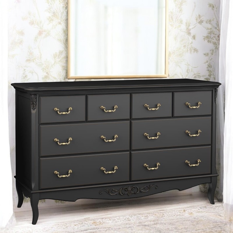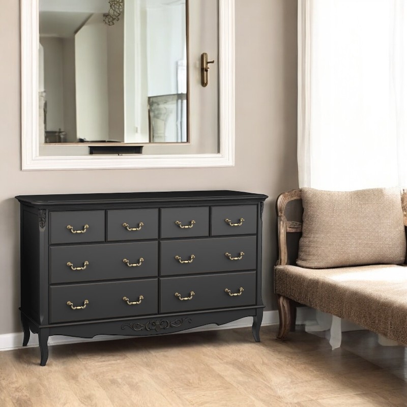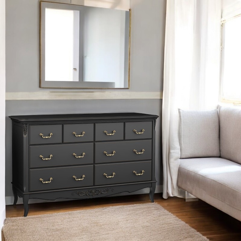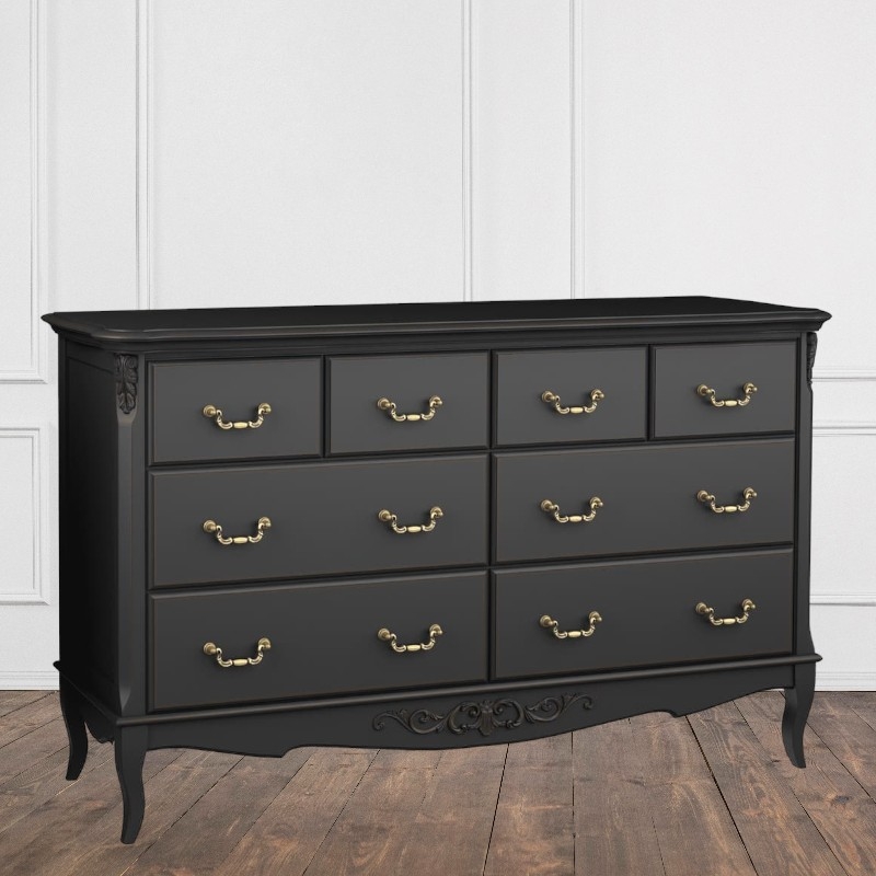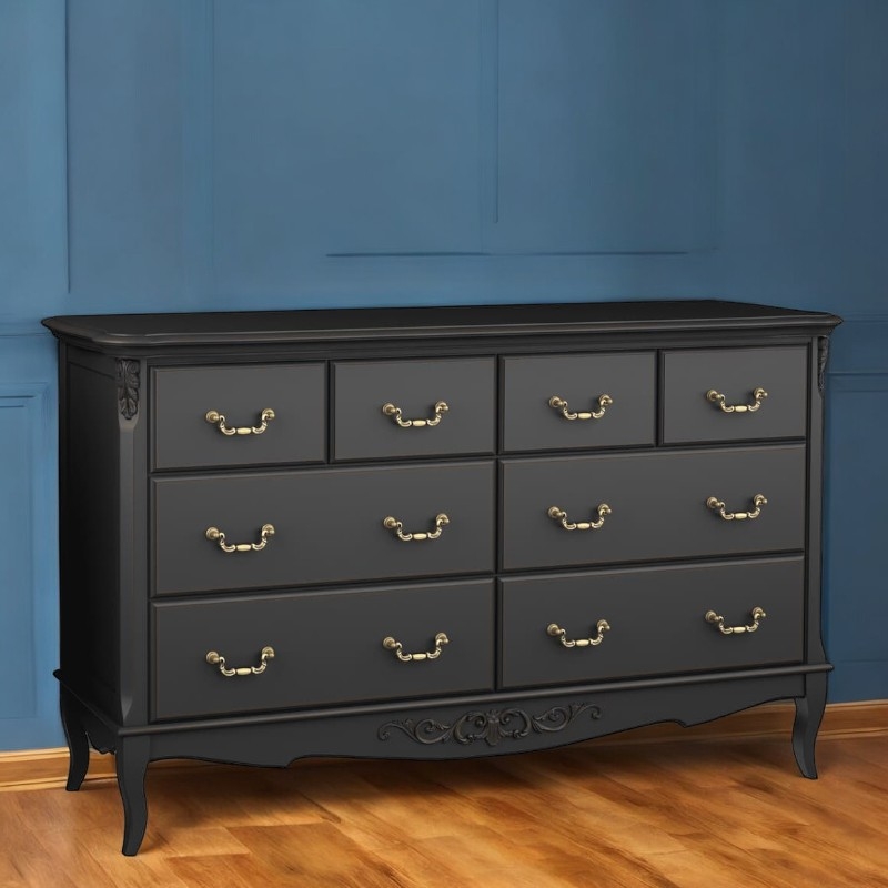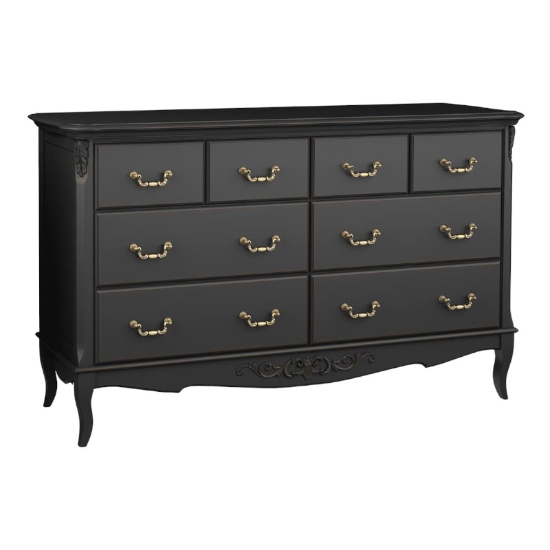 Комод Marlette (Aletan, арт. В408BL) с восемью ящиками — изящное решение для спальни в классическом или провансальском стиле. Модель сочетает в себе утончённый дизайн и практичность, создавая уютную и гармоничную атмосферу в интерьере. Комод изготовлена из массива бука, МДФ и берёзовой фанеры, что обеспечивает прочность конструкции и долгий срок службы. Многослойная эмалевая отделка в черном цвете (RAL 9005) придаёт изделию благородный внешний вид и защищает поверхность от внешних воздействий.
