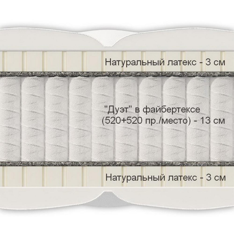 - Независимый пружинный блок «Дуэт» (пружина внутри пружины) в кармашке из файбертекса (520 + 520 пружин на спальное место). Пружинный блок создан, чтобы создать оптимальную поддержку для людей разного веса. Люди с небольшим весом не испытывают излишней жёсткости от большого количества пружин. При увеличении нагрузки от тела в работу вступают вторые, внутренние пружины не давая проваливаться исключая "эффект гамака" — высота 13 см;