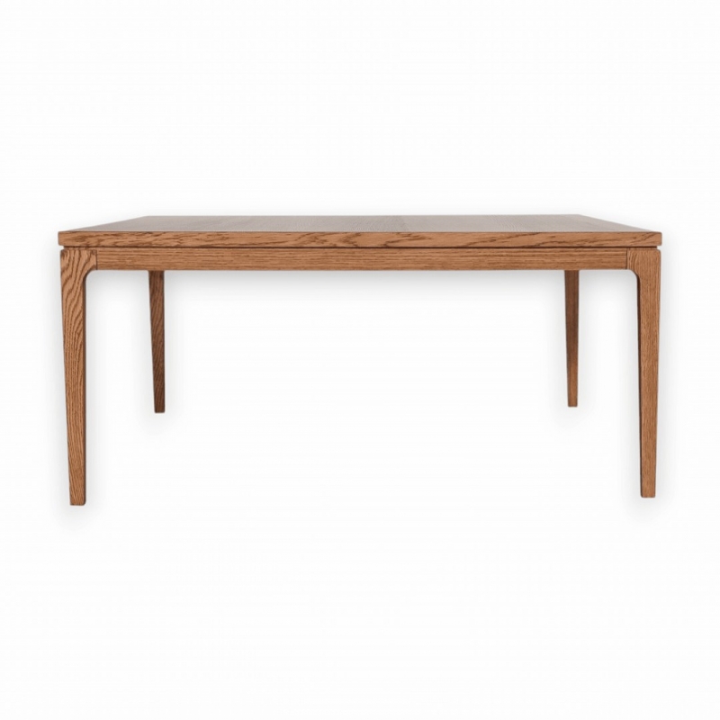 Фасады с рельефной рейкой формируют выразительный ритм и глубину поверхности, создавая эффект лёгкой тени и динамики при изменении освещения. Этот приём подчёркивает архитектурность коллекции и придаёт мебели визуальную сложность без избыточного декора. Основные элементы выполнены из массива и шпона дуба — натурального материала с характерной текстурой, глубокими тёмными прожилками и мягким естественным блеском.