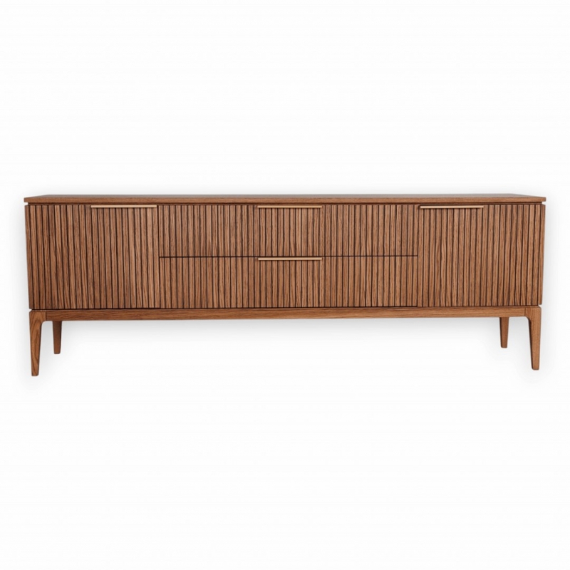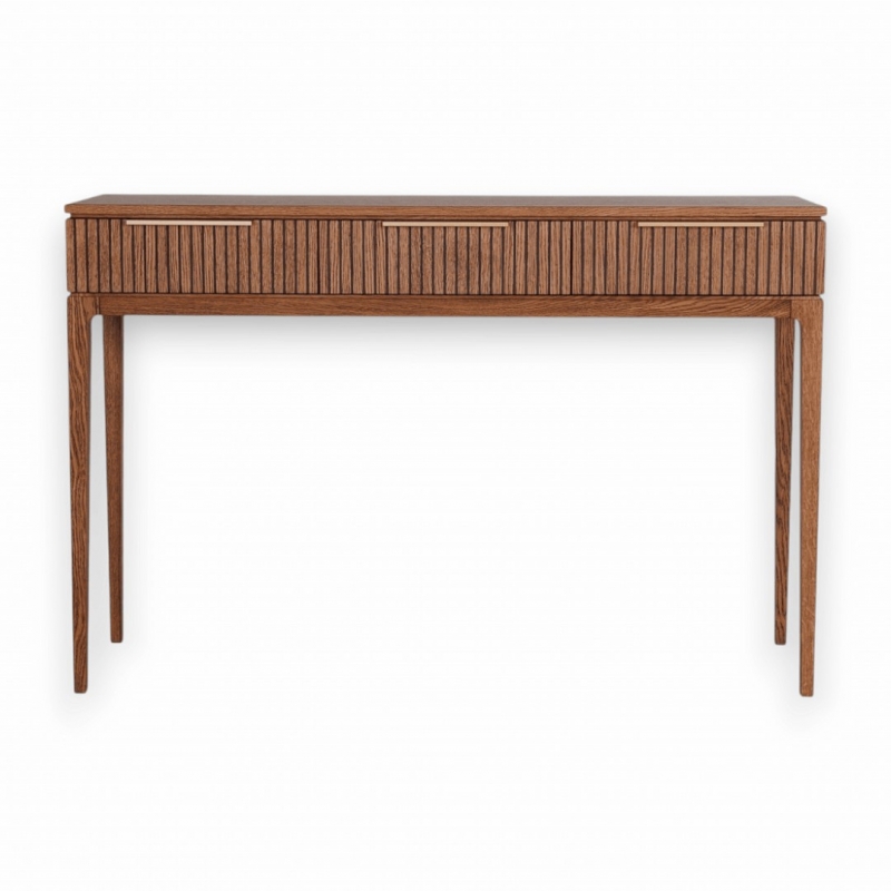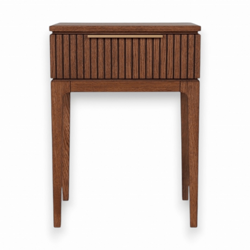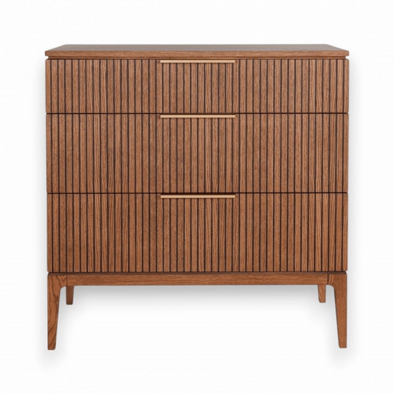 Основные элементы коллекции выполнены из массива и шпона дуба в отделке «Дуб Честерфилд» — благородного натурального материала с выразительной текстурой, глубокими тёмными прожилками и мягким естественным блеском. Акцентные ручки из натуральной латуни добавляют мебели статусности и тактильной ценности, подчёркивая внимание к деталям и высокий уровень исполнения.