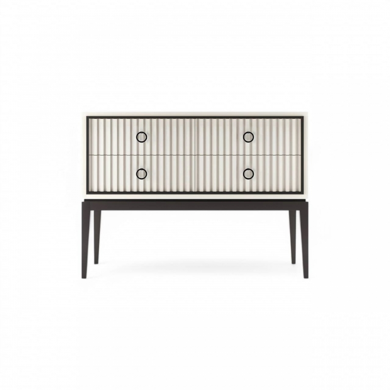 Низкий комод из коллекции Ницца бренда Classico Italiano, арт. 8047/L/BL/BL. Дизайн комода выполнен в американском варианте стиля Ар-деко. Комод на высоких ножках, выполненного из качественного массива бука и дополняется МДФ. Комод оснащен 4 выдвижными ящиками c доводчиками. Фасадная часть ящиков комода украшена каннелюрами.