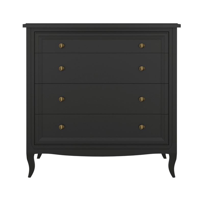 Комод Majessa (Aletan, арт. М404BL) с четырьмя ящиками, в чёрном цвете — элегантное решение для спальни в неоклассическом стиле. Комод Алетан Маджесса изготовлен из массива дерева и МДФ с многослойной эмалевой отделкой, гарантирующей долговечность.