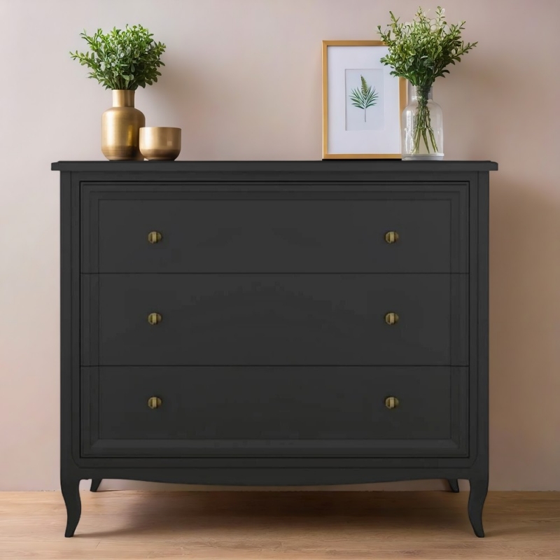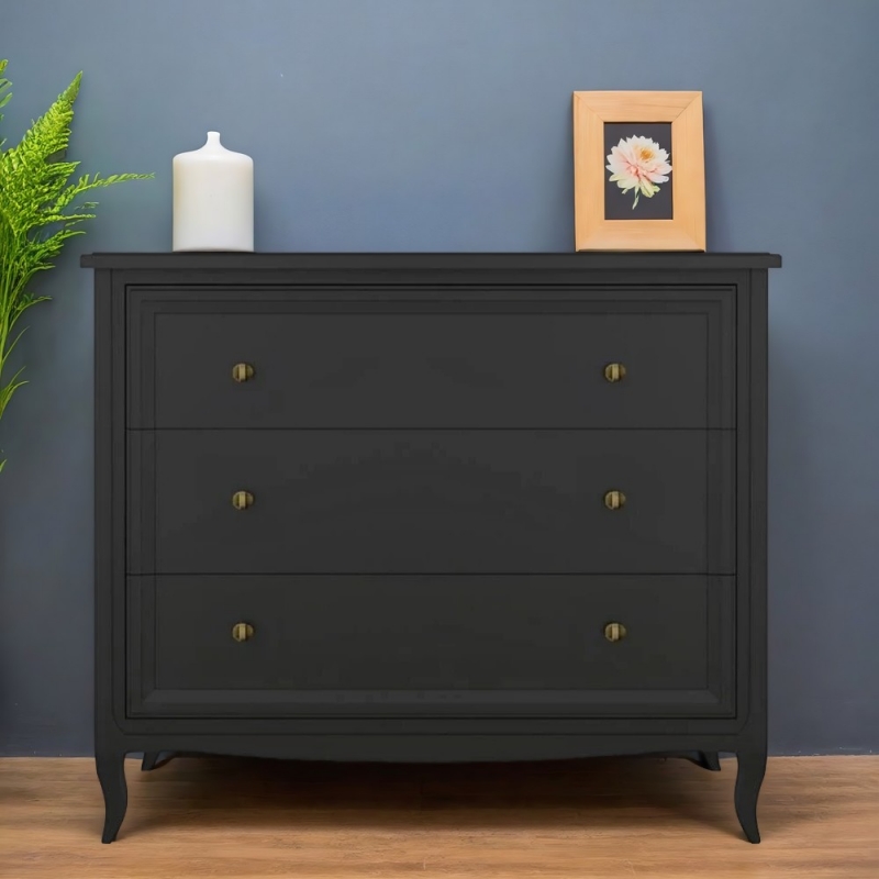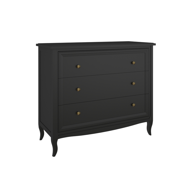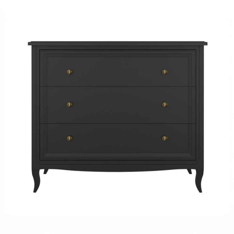 Комод Majessa (Aletan, арт. М401BL) с тремя ящиками, в чёрном цвете — элегантное решение для спальни в неоклассическом стиле. Комод Алетан Маджесса изготовлен из массива дерева и МДФ с многослойной эмалевой отделкой, гарантирующей долговечность.