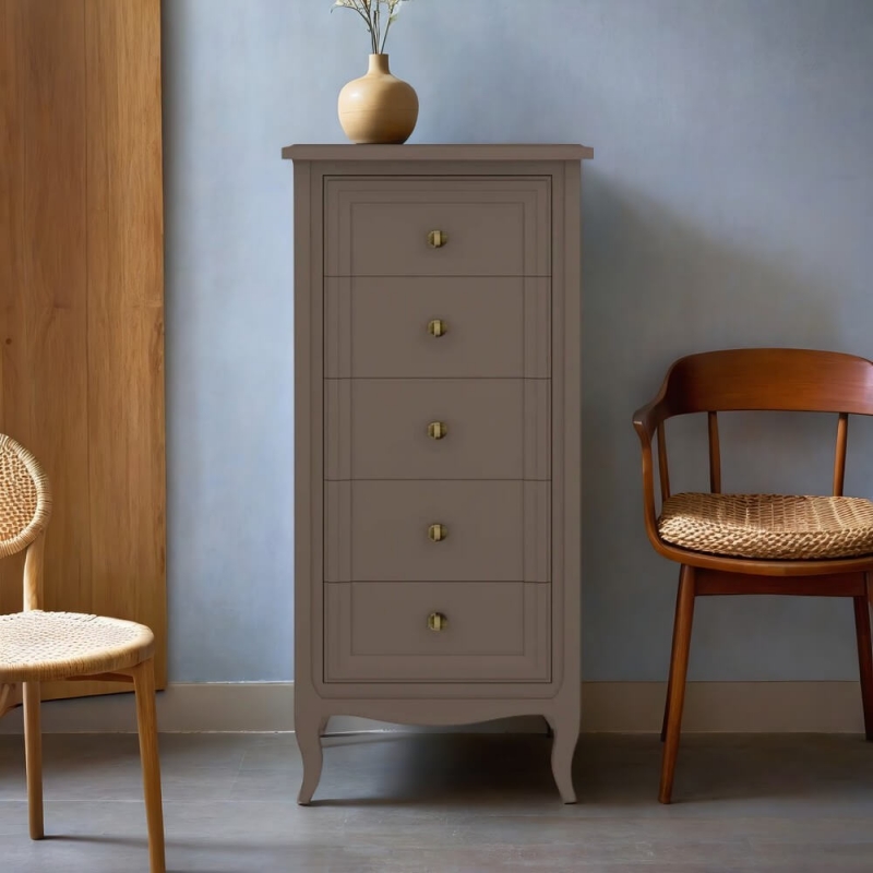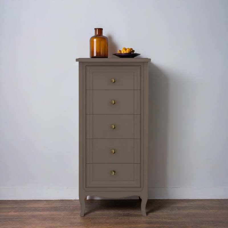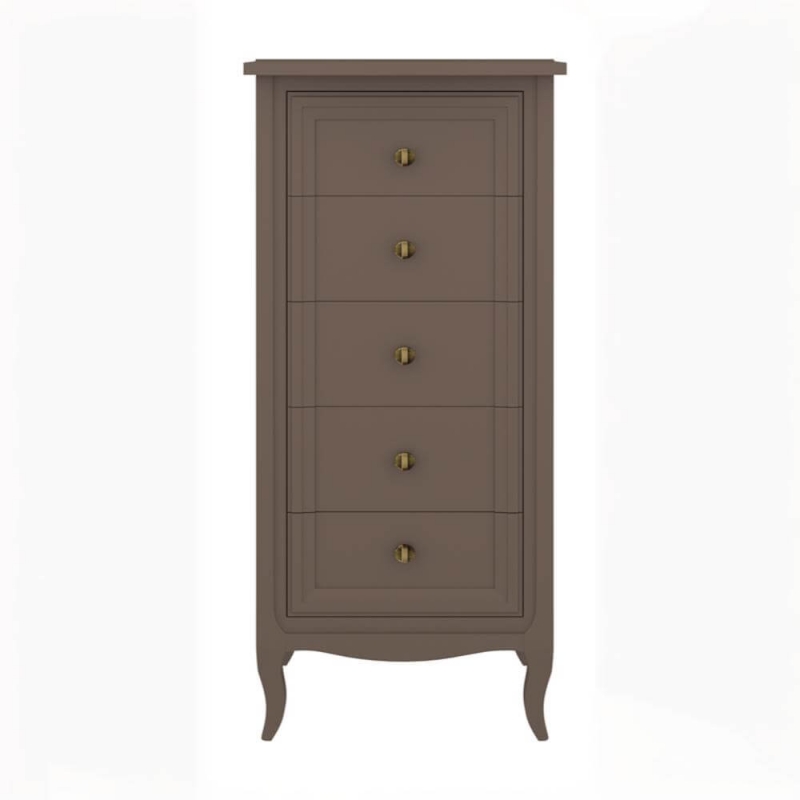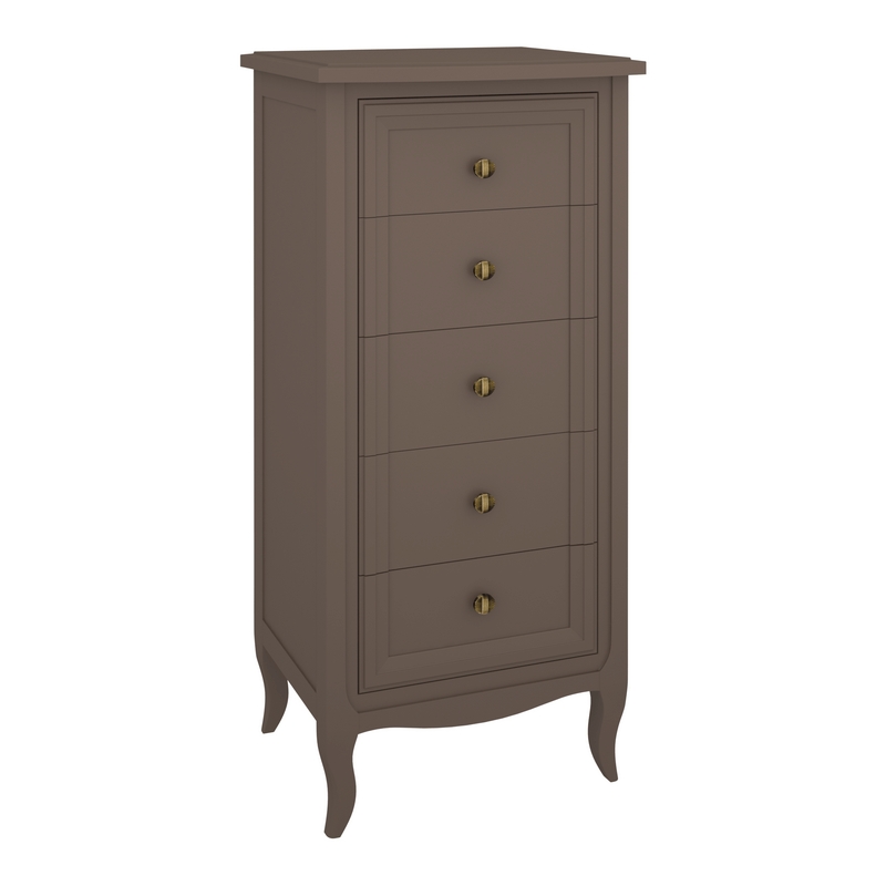 Высокий комод Majessa (Aletan, арт. М315Q) с пятью ящиками, в коричневом цвете — элегантное решение для спальни в неоклассическом стиле. Комод Алетан Маджесса изготовлен из массива дерева и МДФ с многослойной эмалевой отделкой, гарантирующей долговечность.