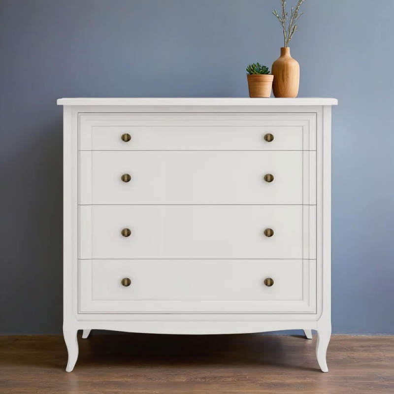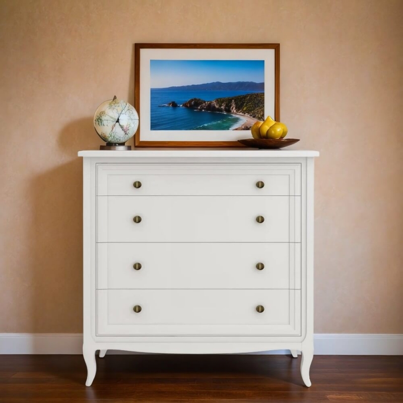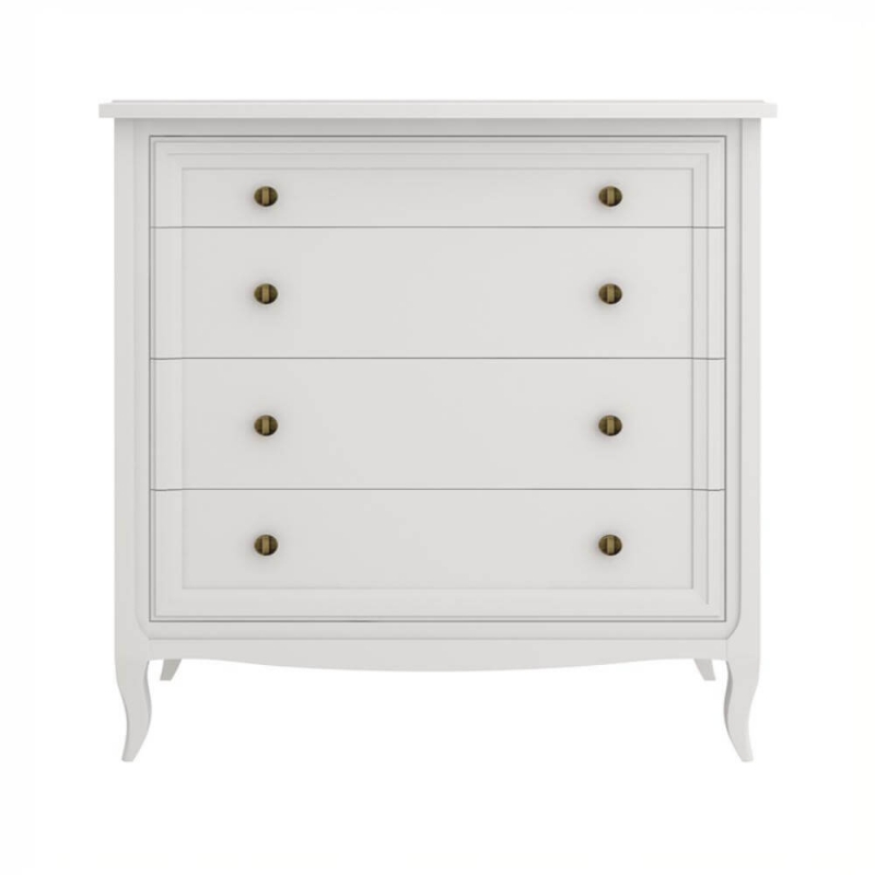 Комод Majessa (Aletan, арт. М404W) с четырьмя ящиками, в белом цвете — элегантное решение для спальни в неоклассическом стиле. Комод Алетан Маджесса изготовлен из массива дерева и МДФ с многослойной эмалевой отделкой, гарантирующей долговечность.