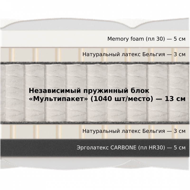 - ErgoLatex Carbon (пл. HR30): этот передовой пенный материал отличается высокой эластичностью, отличной вентиляцией и не накапливает статическое электричество. Кроме того, Эрголатекс Карбон обладает антибактериальными свойствами и устраняет неприятные запахи благодаря природным свойствам угля. — 5 см
