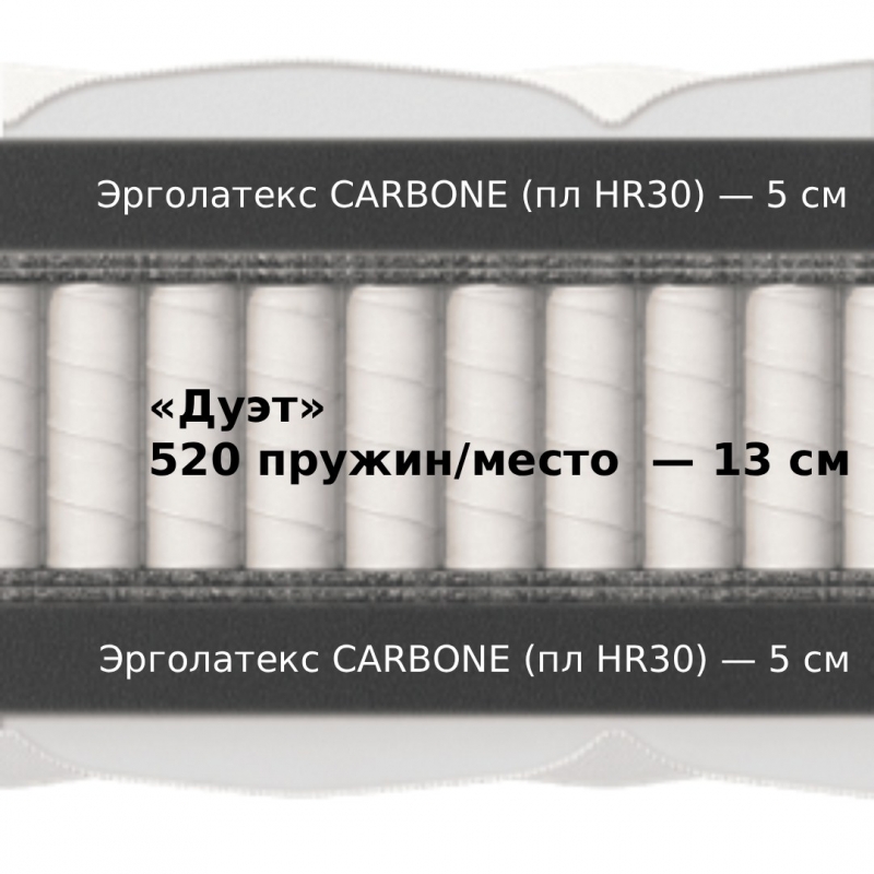 - Адаптивный блок независимых пружин - Дуэт. Система: пружина внутри пружины. Каждая в кармашке из долговечного файбертекса (520 + 520 пружин на спальное место). Пружинный блок подстраивается под вес спящего. Человек с небольшим весом не испытывает излишней жёсткости от слишком упругих пружин. При увеличении нагрузки от спящего с бОльшим весом в работу вступают вторые, внутренние, пружины не давая проваливаться, исключая "эффект гамака". Идеально подходит как для большого, так и маленького веса, а также пар с заметной разнице в весе — высота 13 см;