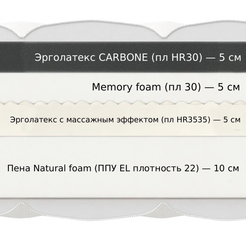 - Memory foam — Уникальная анатомическая пена, идеально повторяет контур тела, придавая эффект погружения (плотность 30 кг/м3) — 5 см