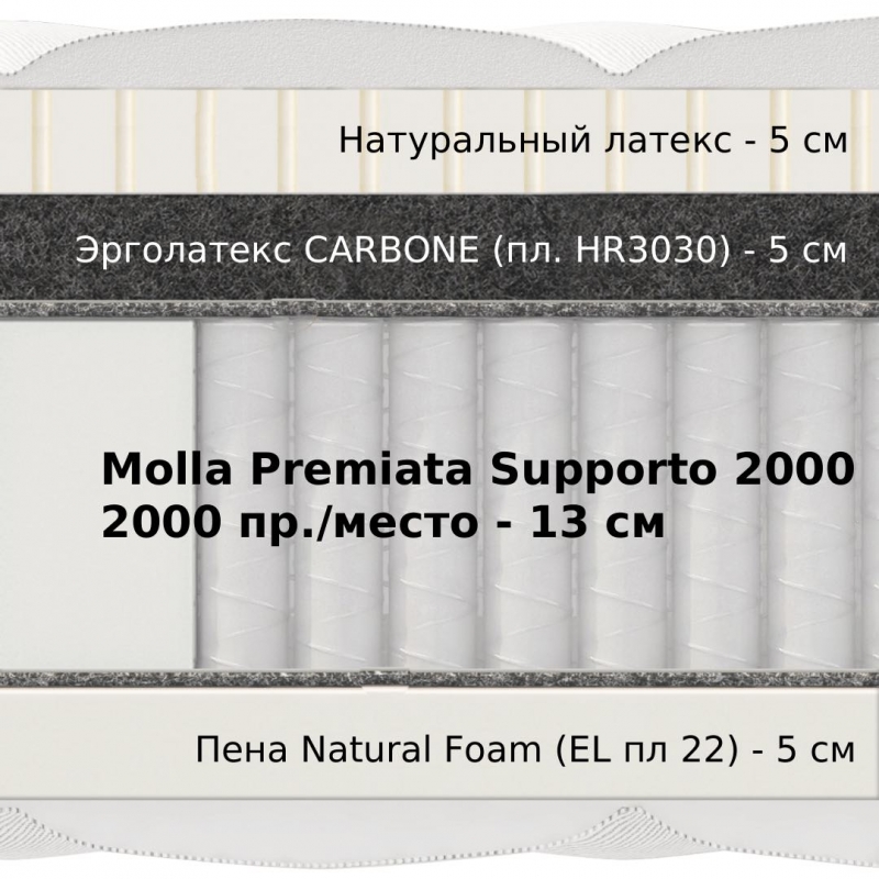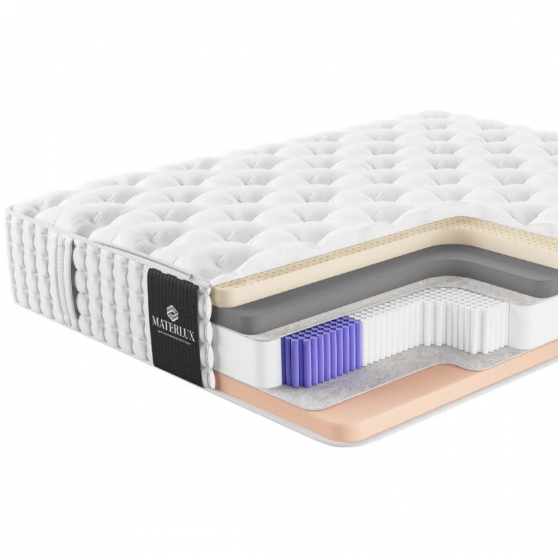 Премиальный матрас фабрики MaterLux, модель Mortirolo серии Premium, с толстым слоем натурального бельгийского латекса и адсорбирующего эрголатекса Carbone, все это собрано на уникальном блоке адаптивных пружин Микропакет 2000.