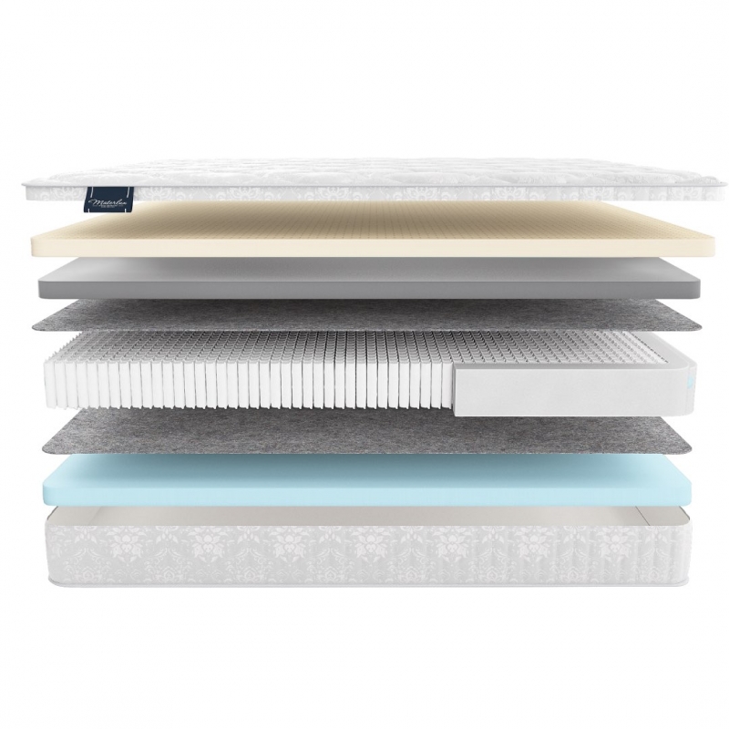 Премиальный матрас фабрики MaterLux, модель Mortirolo серии Premium, с толстым слоем натурального бельгийского латекса и адсорбирующего эрголатекса Carbone, все это собрано на уникальном блоке адаптивных пружин Микропакет 2000.