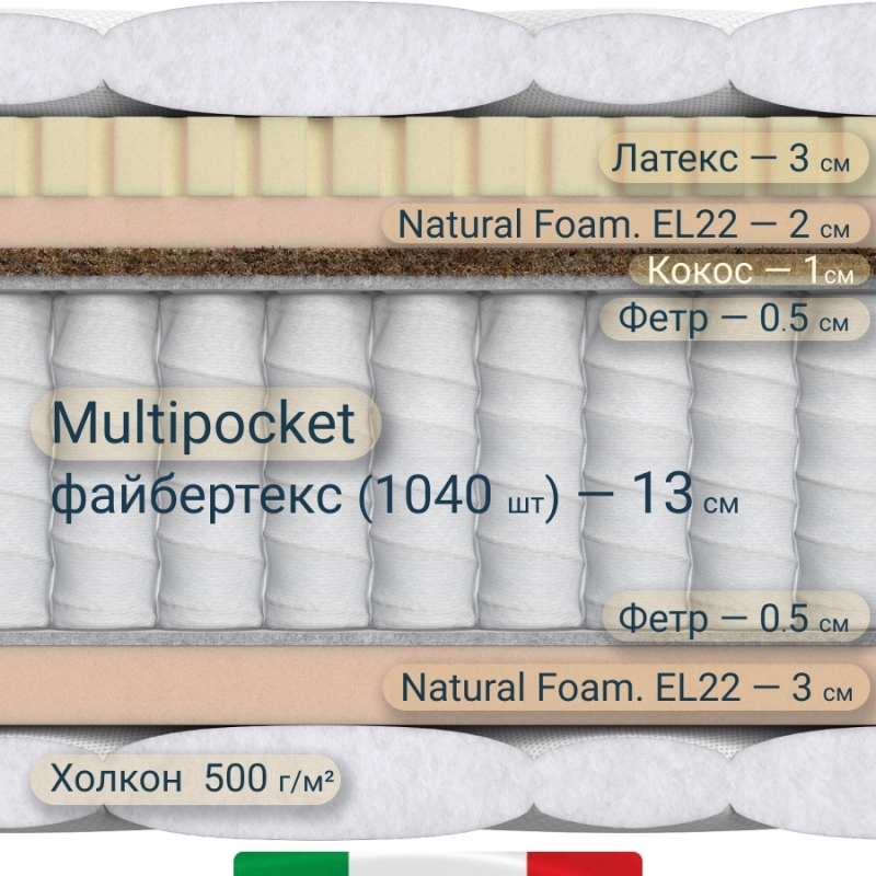 Создан на основе современных материалов: слой натурального латекса (Бельгия), анатомическая пена Natural Foam, латексированный кокос. Основа матраса: пружинный блок независимых пружин в файбертексе - "Мультипокет", 1040 пружин на спальное место с кармашками из файбертекса.