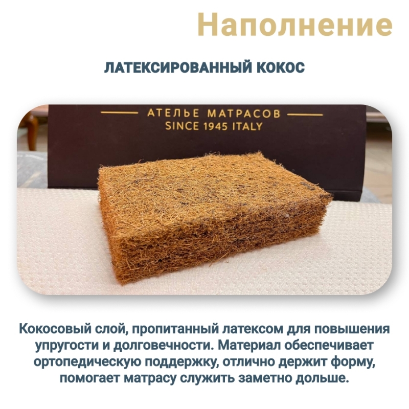 Создан на основе современных материалов: слой натурального латекса (Бельгия), анатомическая пена Natural Foam, латексированный кокос. Основа матраса: пружинный блок независимых пружин в файбертексе - "Мультипокет", 1040 пружин на спальное место с кармашками из файбертекса.