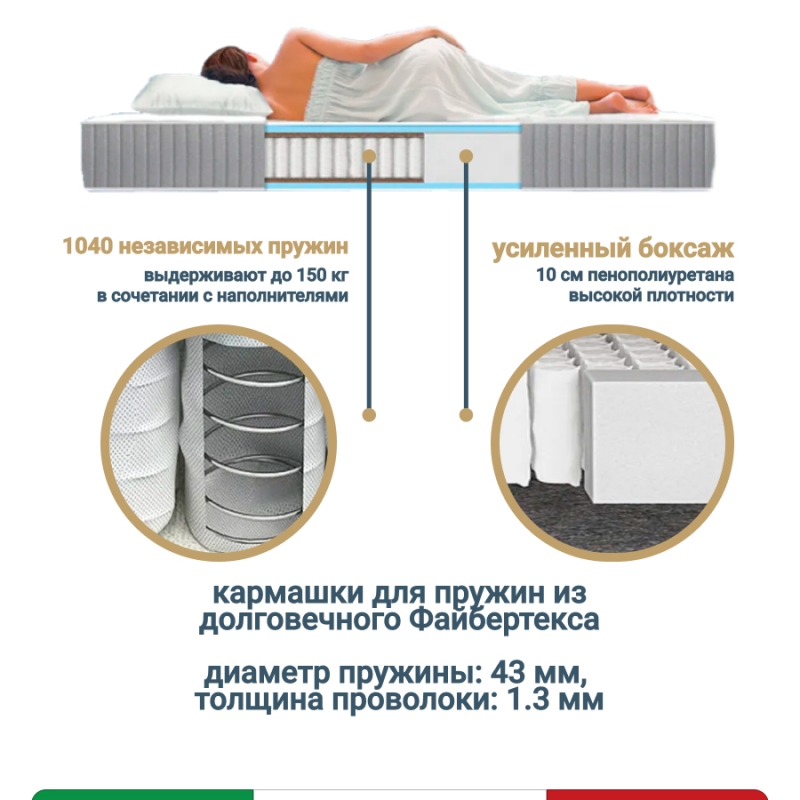Матрас Тревисо Макси Матерлюкс создан на основе современного пружинного блока независимых пружин — "Multipocket S1000", 1040 пружин на спальное место, в чехлах из долговечного Файбертекса.