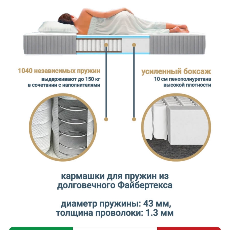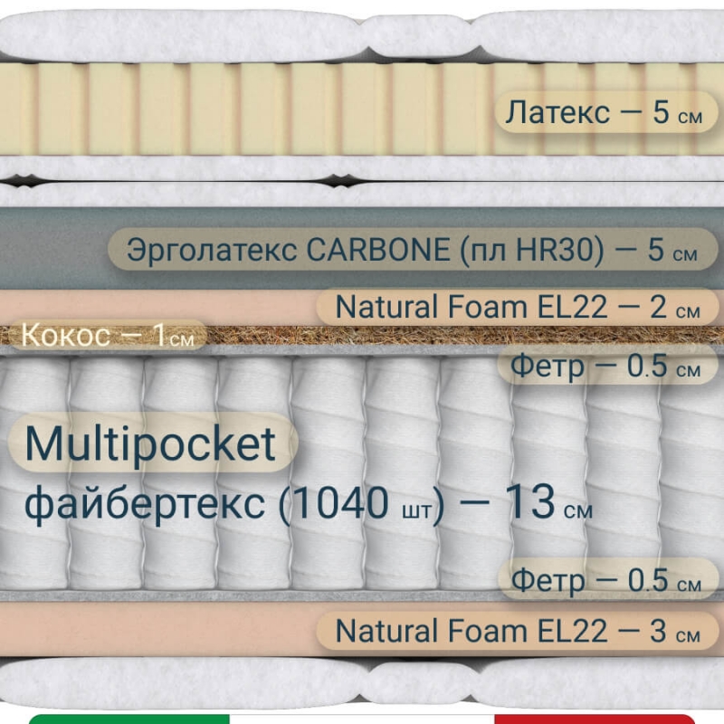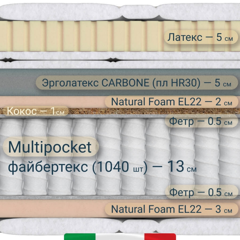 Создан на основе современных материалов: натурального латекса (Бельгия), эрголатекса с угольной пропиткой-адсорбентом CARBONE, пены Natural Foam EL22, латексированной кокосовой койры, плотного термофиксированный фетра. Основа матраса: пружинный блок независимых пружин в файбертексе - "Мультипакет", 1040 пружин на спальное место