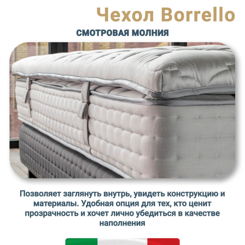Чехол Borello выполнен из жаккарда Vip Satin светло-серого цвета, отличающегося благородной текстурой, высокой износостойкостью и мягкой тактильностью. Ткань содержит 68% вискозы и 32% полиэстера, что обеспечивает оптимальный баланс комфорта, прочности и долговечности.