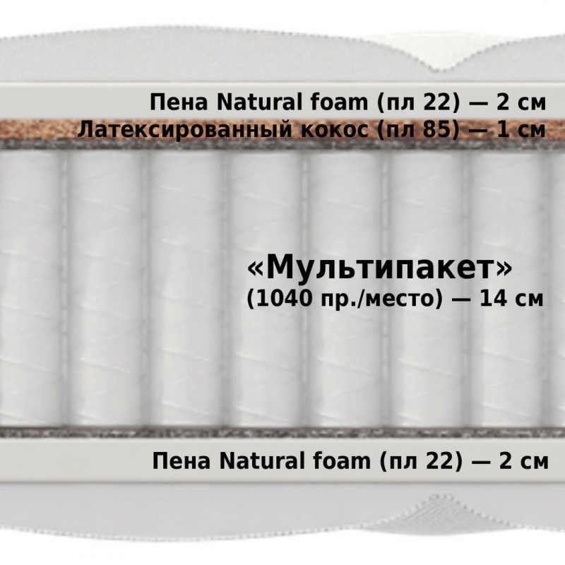 - Пружинный блок независимых пружин в спандбонде Multipocket 1000 (1040 пружин на спальное место) — высота — 14 см. Блок Мультипокет обладает идеальным балансом между хорошей поддержкой и комфортной мягкостью