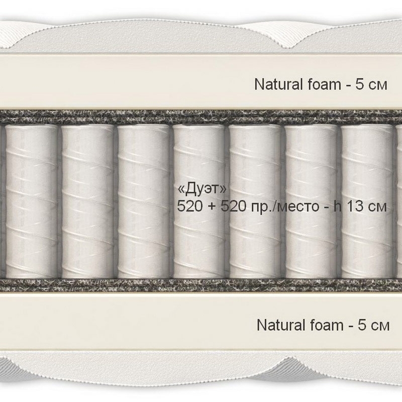 - Независимый пружинный блок «Дуэт» (пружина внутри пружины) в кармашке из файбертекса (520 + 520 пружин на спальное место). Пружинный блок создан, чтобы создать комфортную поддержку для людей разного веса. Спящий с небольшим весом не испытывает излишней жёсткости от большого количества пружин. При увеличении нагрузки от пользователя с бОльшим весом в работу вступают вторые, внутренние, пружины не давая проваливаться, исключая "эффект гамака" — высота 13 см;