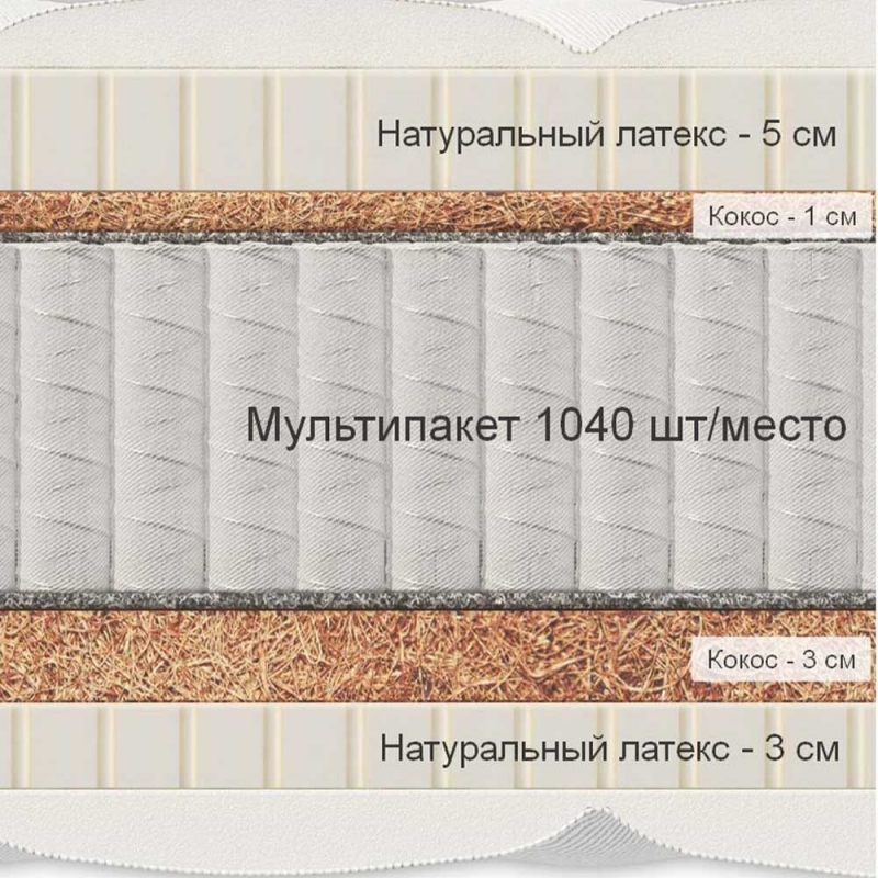 - Пружинный блок независимых пружин в индивидуальных кармашках из файбертекса Multipocket 1000 (1040 пружин на спальное место) — высота 13 см. Блок Мультипокет обладает идеальным балансом между хорошей поддержкой и комфортной мягкостью