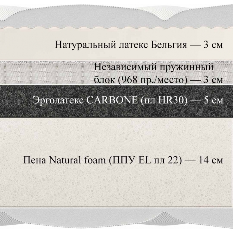 Двусторонний мягкий матрас Prima Latex Carbone серии New Elite с слоем натурального латекса (Бельгия), блоком адаптивных нано-пружин и ковром из адсорбирующего эрголатекса Carbone от российско-итальянского ателье Materlux.