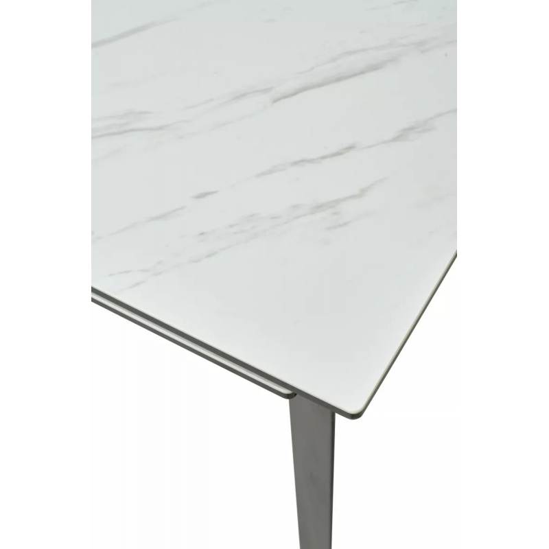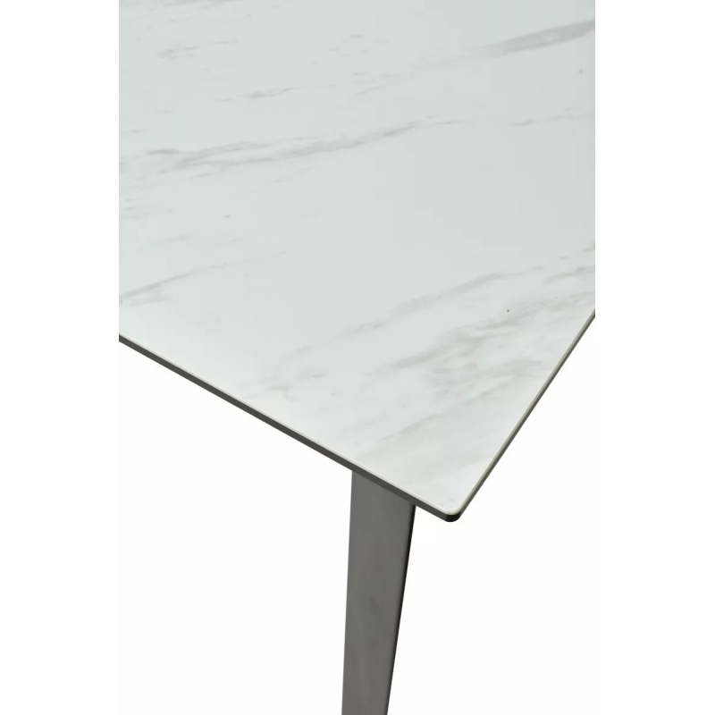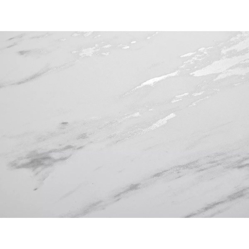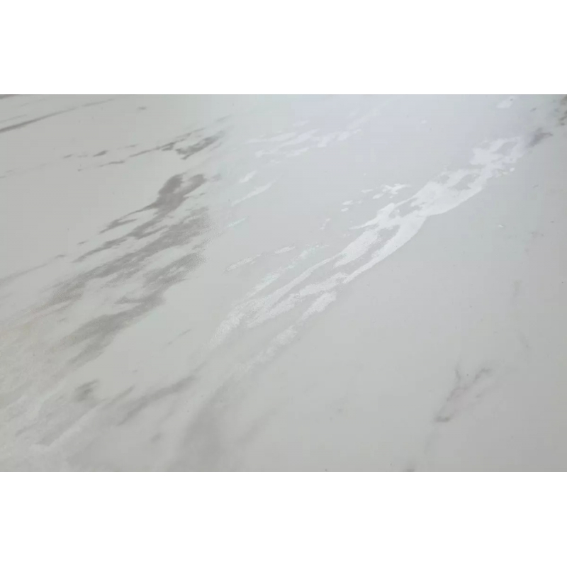 Столешница выполнена по технологии «керамика на стекле» (толщина 11 мм: 3 мм керамика + 8 мм закалённое стекло). Итальянская матовая керамика в оттенке белый мрамор с выразительными прожилками отражает свет, устойчива к царапинам и загрязнениям, легко очищается и выдерживает перепады температур.