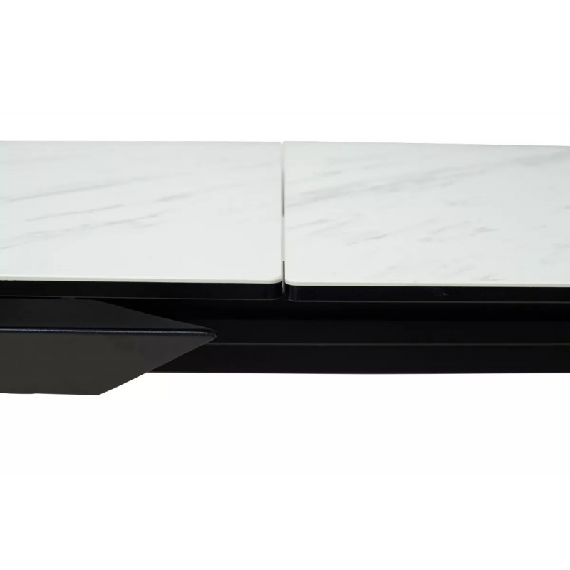 Раздвижной механизм позволяет увеличить длину стола на 60 см. Вставка выдвигается с торца вместе с ножками на встроенных колёсах, которые не царапают пол, что делает процесс раскладывания быстрым и удобным. Рисунок вставки может отличаться от основной поверхности и не являться её продолжением.