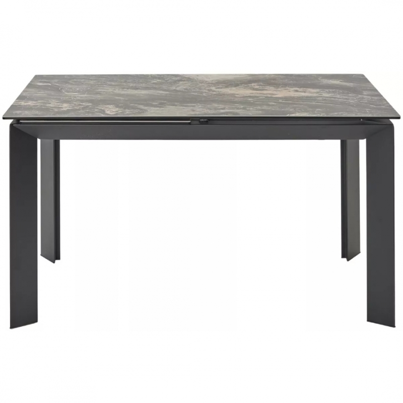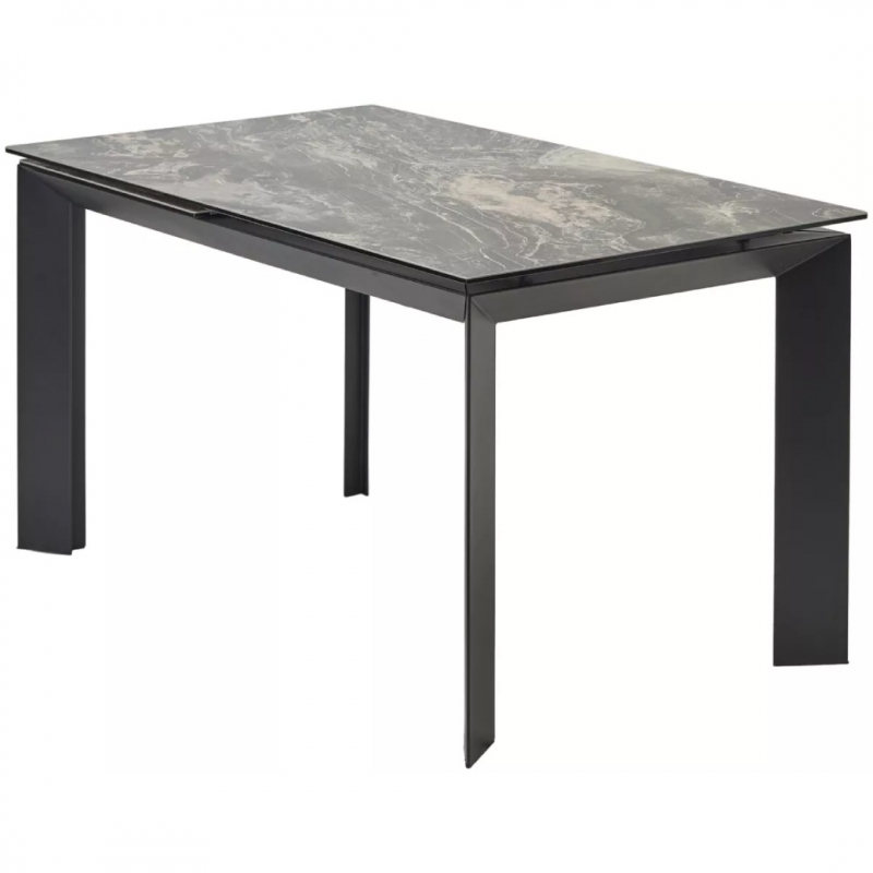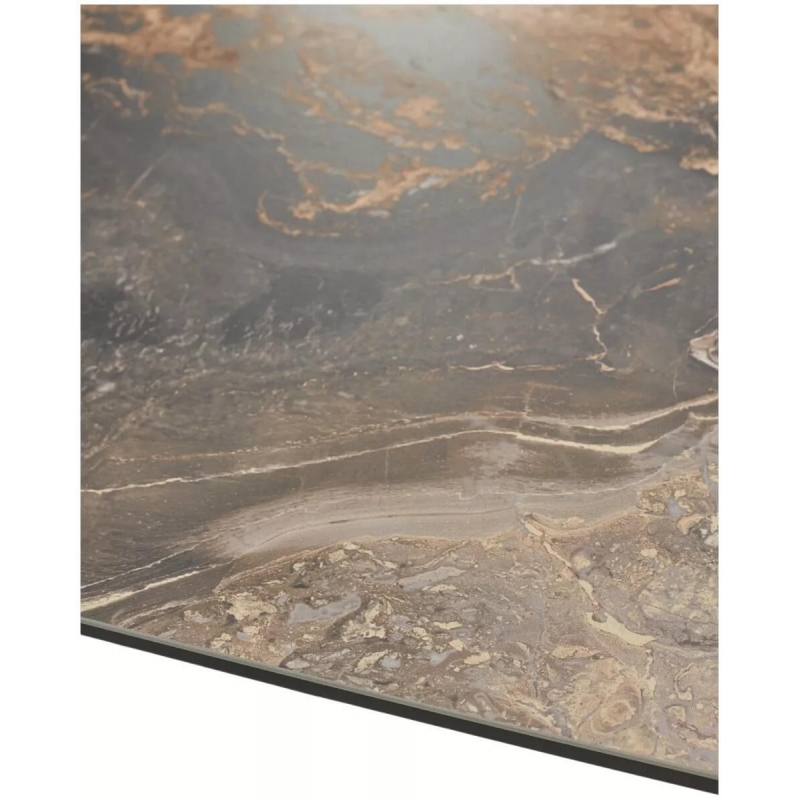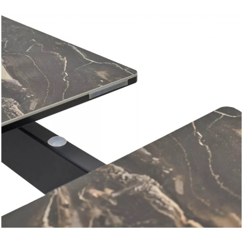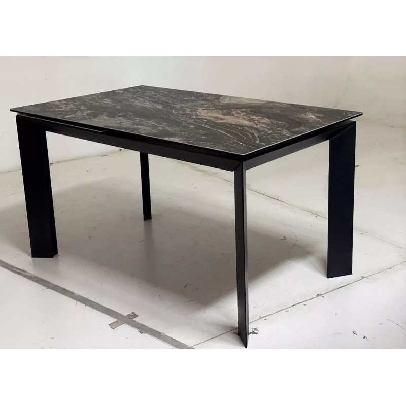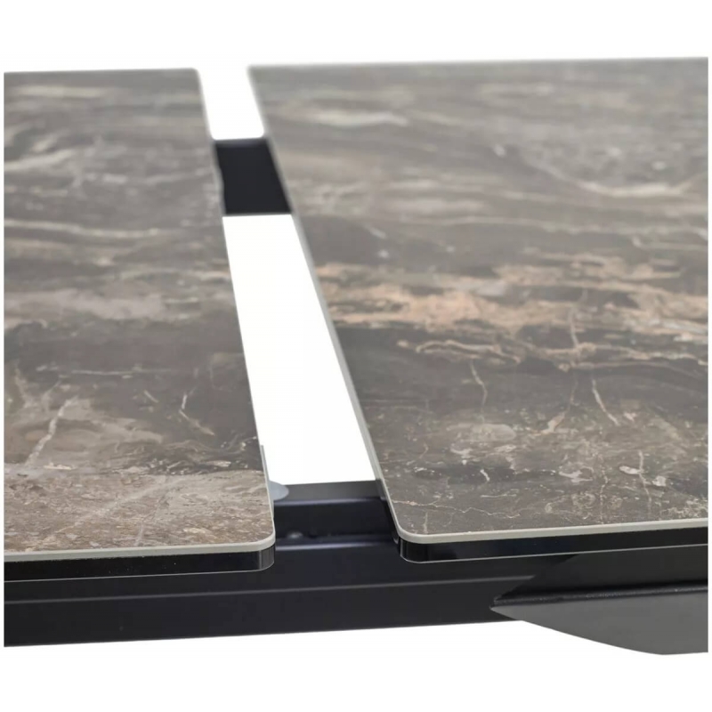 Столешница выполнена по технологии «керамика на стекле» (толщина 13 мм: 3 мм керамика + 10 мм стекло). Матовая керамика «под контрастный черный мрамор» придаёт столу выразительный и стильный вид, устойчива к царапинам и загрязнениям, легко очищается и выдерживает перепады температур.